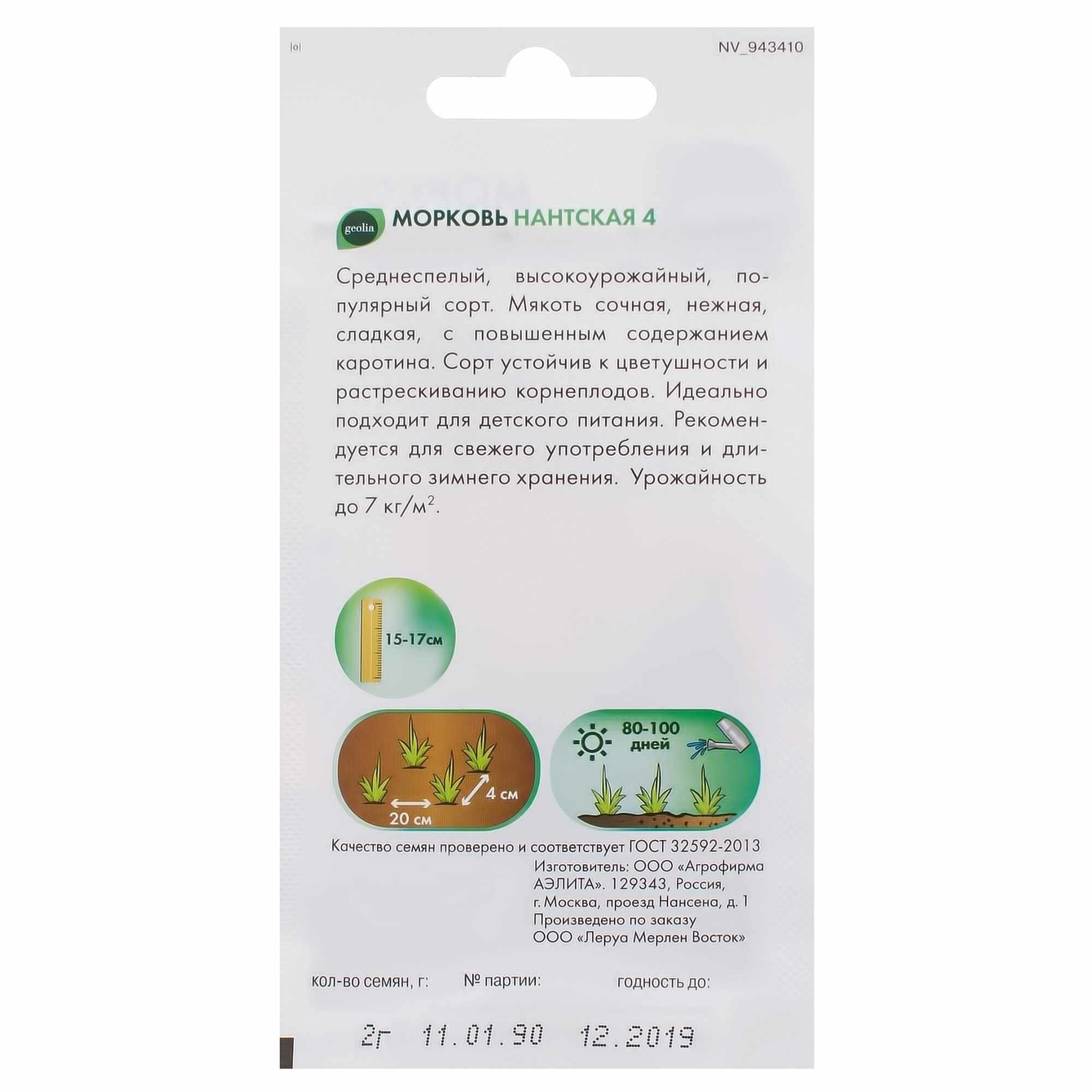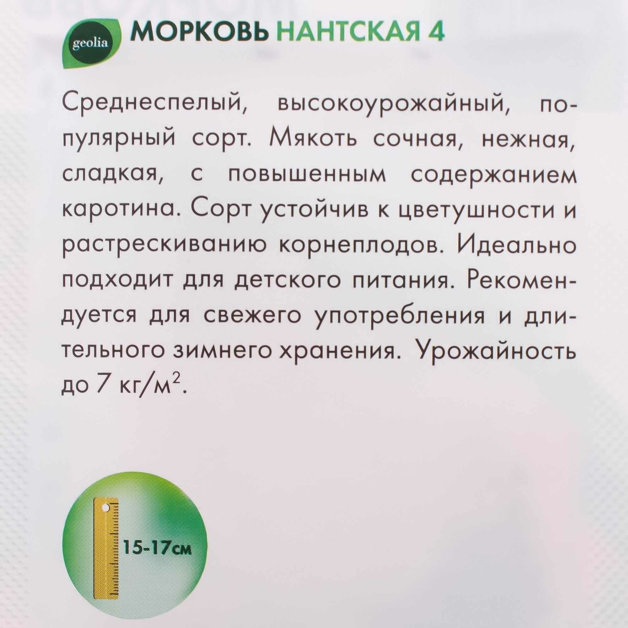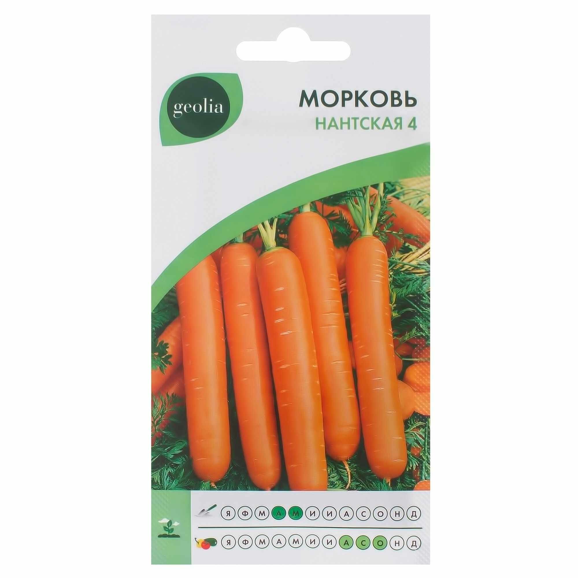 Морковь Geolia «Нантская 4» — среднеспелый сорт, продуктивный в любом регионе России, техническая спелость наступает через 3,5 месяца от всходов. Отличается отменным вкусом и хорошими товарными качествами, используется в детском рационе, употребляется в свежем виде, хорошо хранится. Корнеплоды вырастают до 17 см, весят от 100 до 170 г, не растрескиваются и не склонны к цветушности. Мякоть сладкая и сочная, с повышенным содержанием каротина.