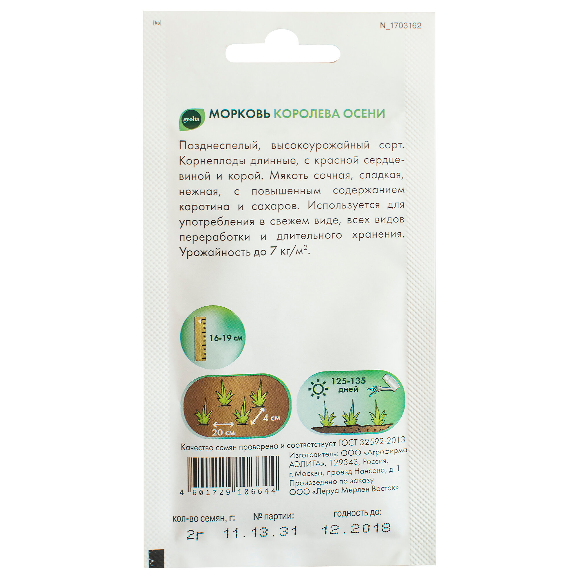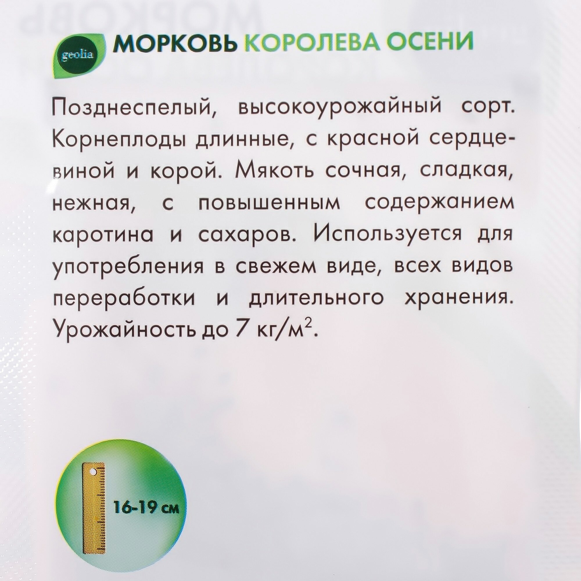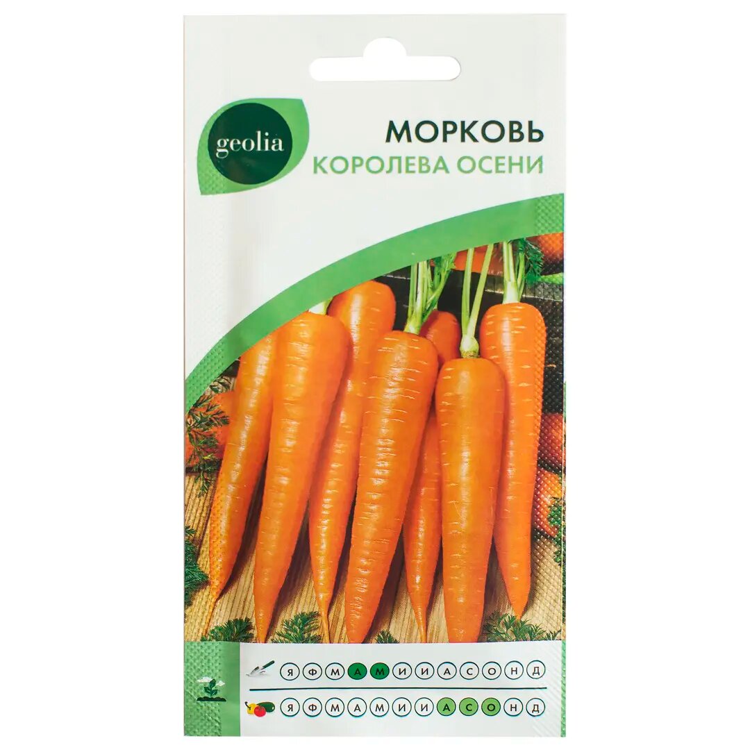 Морковь Королева осени, Geolia – сорт среднеспелый, пользуется большой популярностью у садоводов во всех регионах России. В среднем период с момента всходов до сбора урожая составляет 100-120 дней. Корнеплод имеет цилиндриескую форму, достигает длины 22 см, цвет стандартный ярко-оранжевый. «Королева осени» отличается высокой урожайностью. В высшей степени устойчива к цветушности и великолепно хранится в течение осенне-зимнего периода. Красивые и ровные морковки рекомендуется употреблять как в свежем виде, так и использовать в консервациях и кулинарных рецептах.