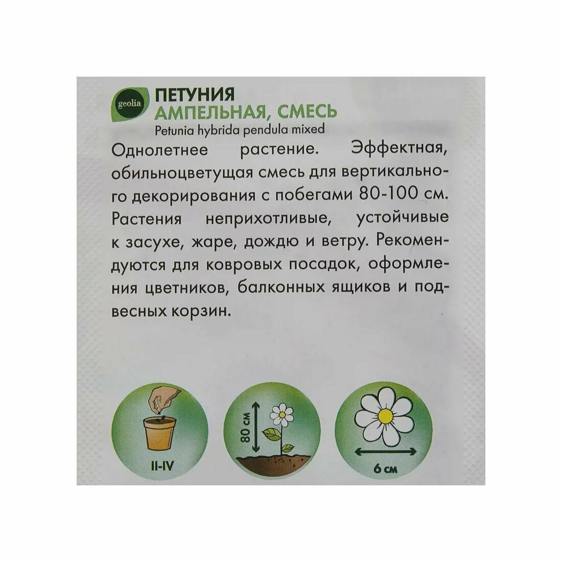 Петуния ампельная Geolia предназначена для оформления приподнятых клумб с ниспадающим ковром цветов, подвесных кашпо, балконных вазонов. Ее изящные побеги длиной до 1 м щедро усыпаны крупными и яркими цветами разных оттенков. Цветение продолжительное — с мая и до октября.