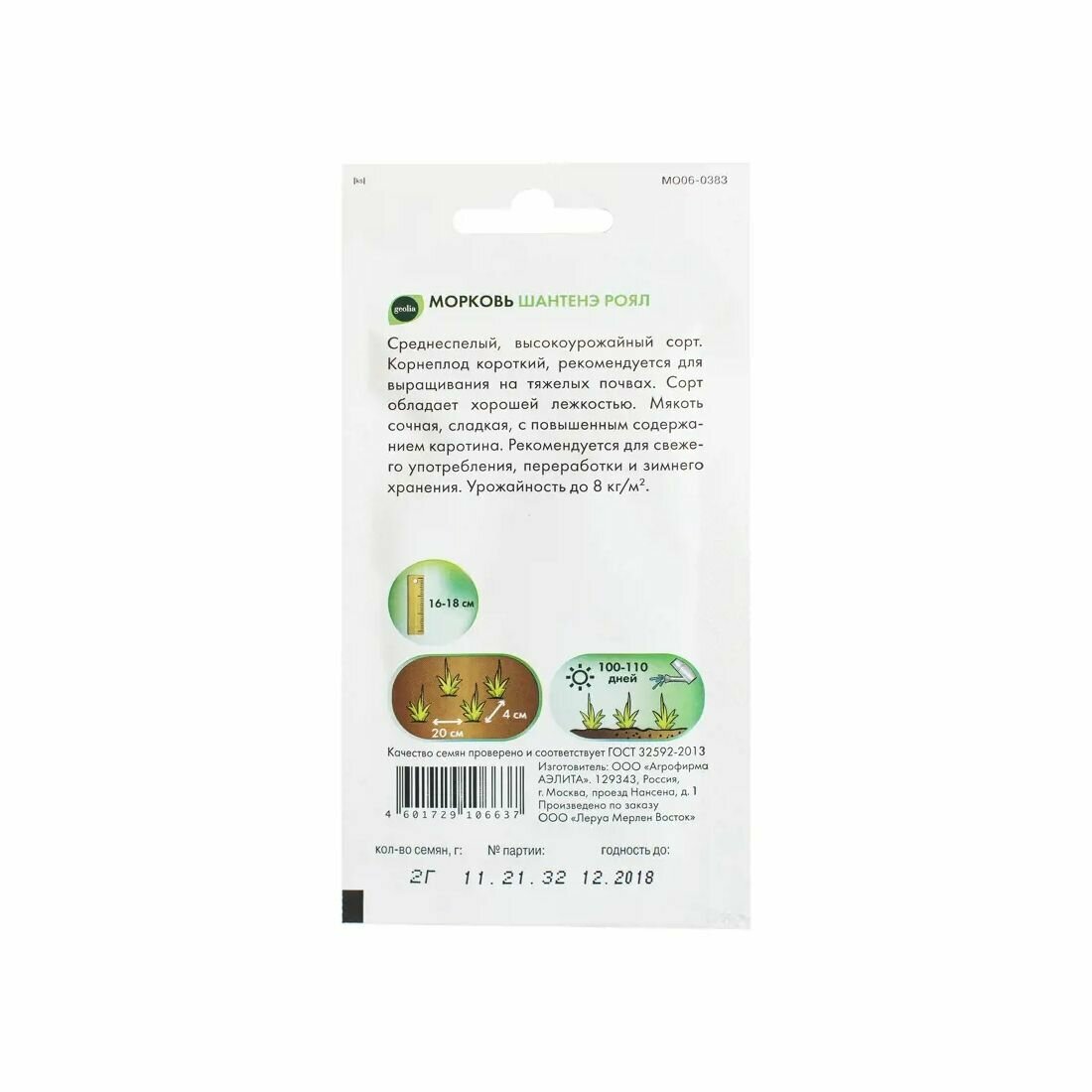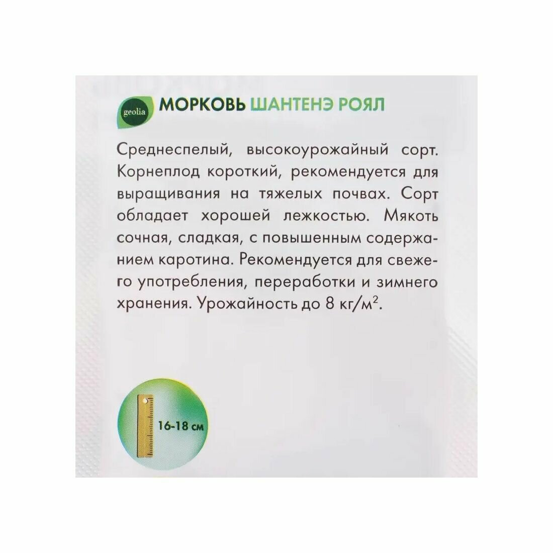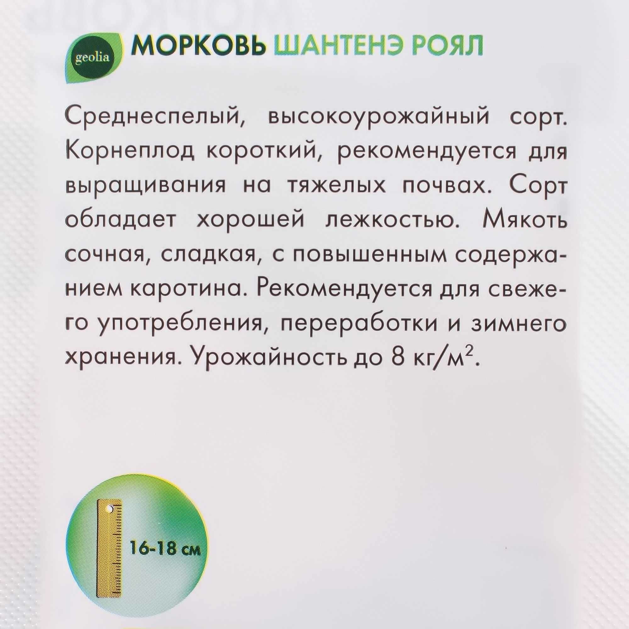 Морковь Geolia «Шантенэ Роял» — универсальный сорт, относящийся к среднеспелым, вегетационный период составляет 100-110 суток со дня прорастания семян. Адаптирован к тяжелым почвам, отлично хранится. Продуктивность высокая — до 8 кг урожая с 1 м². Формирует короткие корнеплоды до 18 см в длину, которые набирают массу до 200 г. Вкусовые качества мякоти хорошие, концентрация каротина повышена.