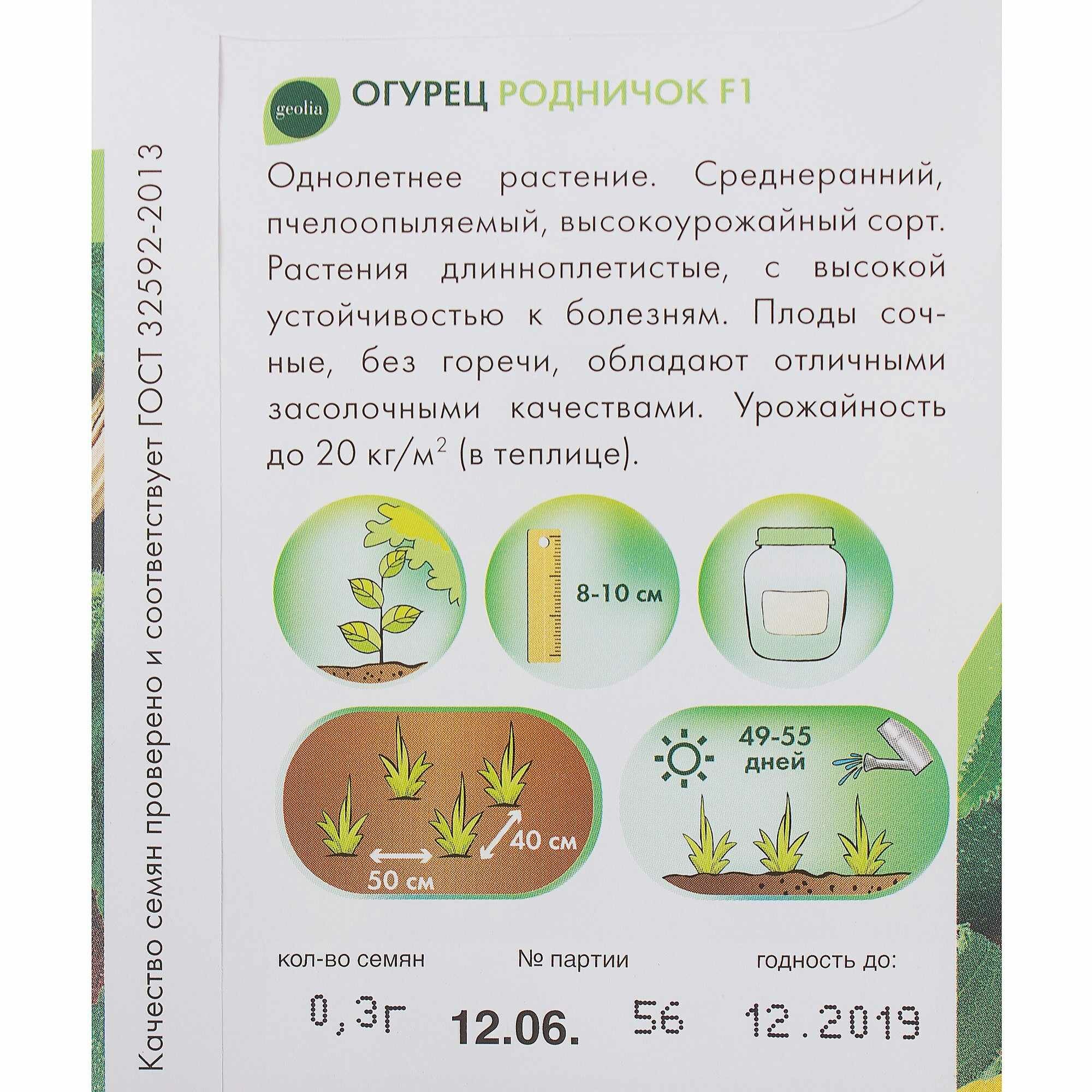 Огурец Geolia «Родничок» F1 — среднеранний высокоурожайный засолочный гибрид. Растение длинноплетистое, пчелоопыляемое. Сбор урожая можно начинать через 49-55 дней после полных всходов. Плоды сочные без горечи, вырастают до 8-10 см в длину. Урожайность в теплице достигает 20 кг/м².