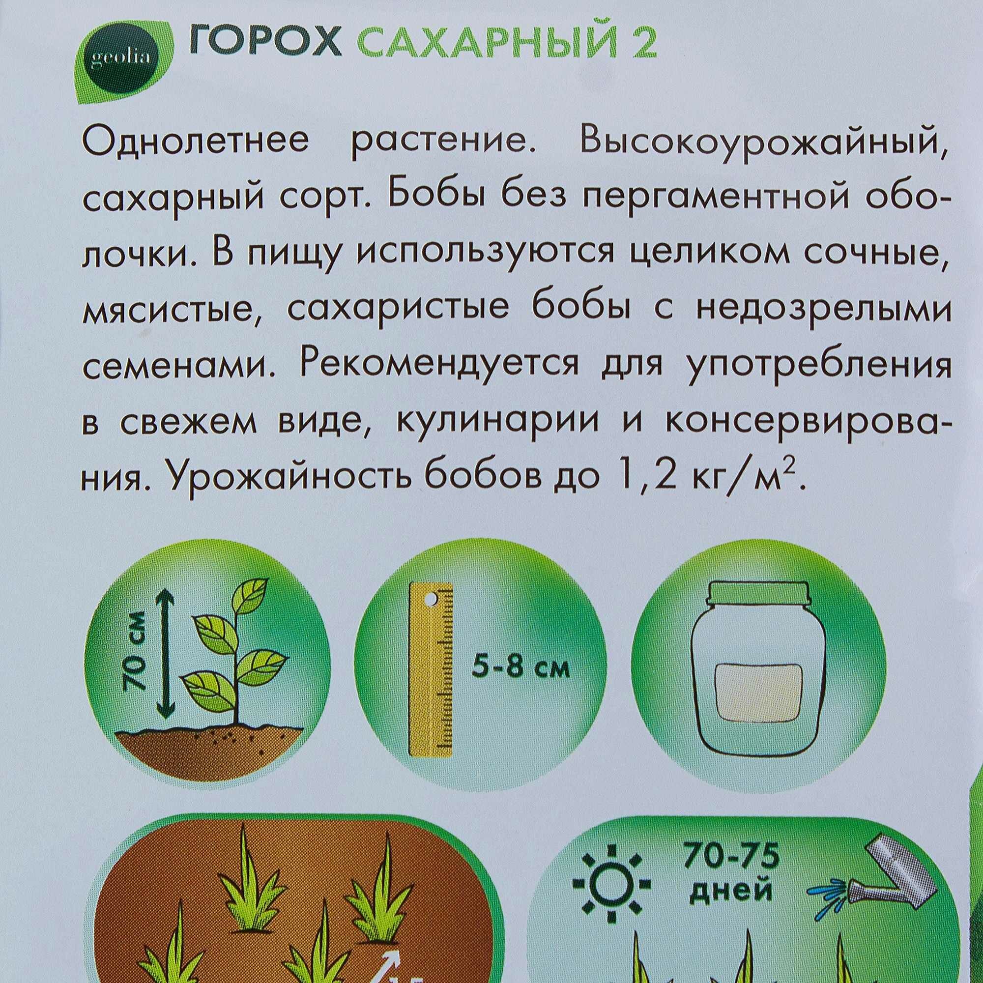 Горох Geolia «Сахарный 2» — сорт бобовых с мягкими и мясистыми створками и нежным сахарным вкусом. Стручки снимают недозрелыми и употребляют в пищу в свежем, тушеном и консервированном виде.