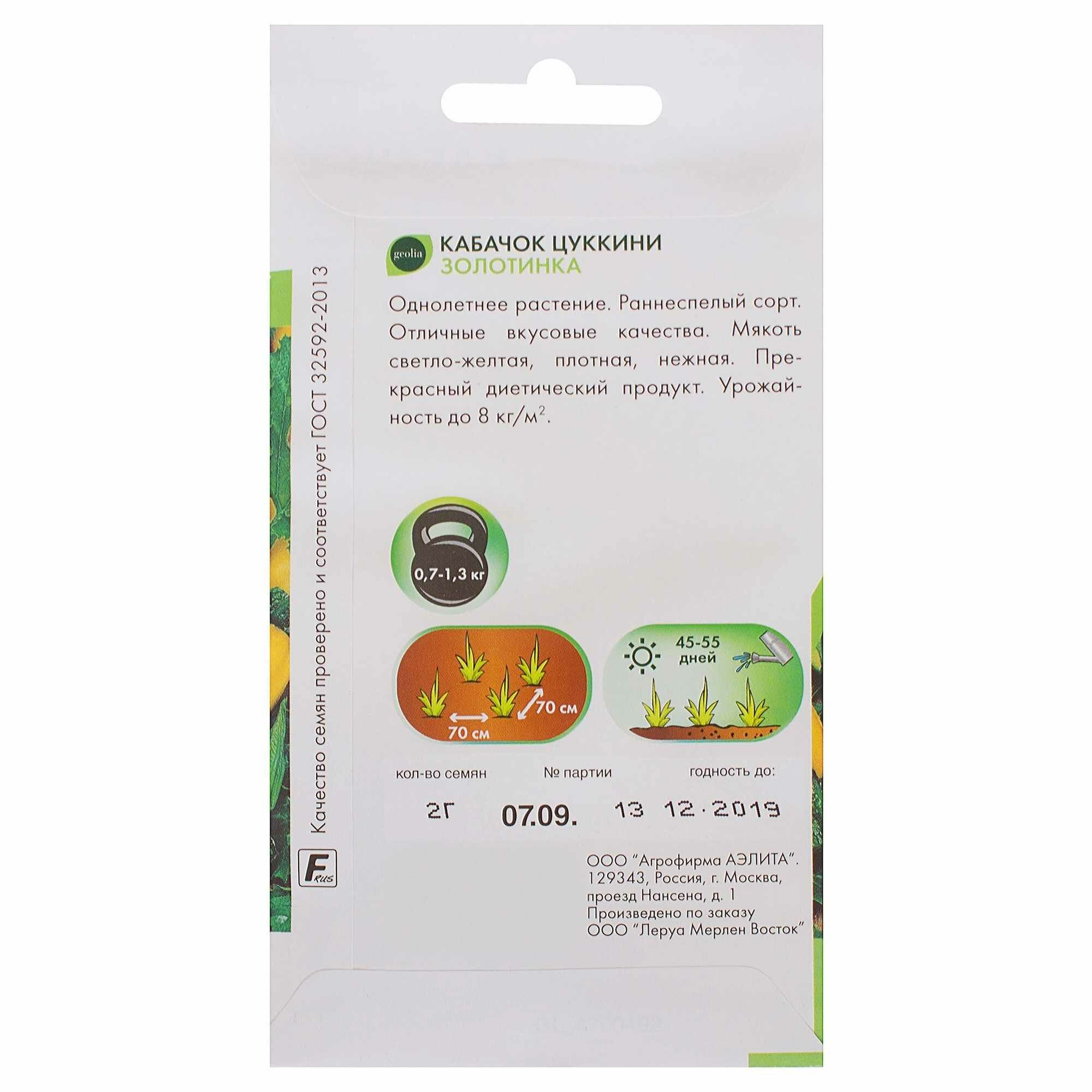 Кабачок цуккини Золотинка, Geolia – сорт раннеспелый, период ожидания первого сбора урожая составляет 40-50 дней. Свое название Золотинка сорт получил за необычный золотистый окрас плодов. Форма правильная цилиндрическая с гладкой поверхностью. Мякоть белая, нежная, слегка сладковатая. Великолепно растет в открытом грунте или в парнике. Сорт устойчив к длительному хранению, за время которого не теряет своих полезных свойств. Давно известны целебные свойства семян, которые применяют в лечении различных заболеваний, например, цистита.