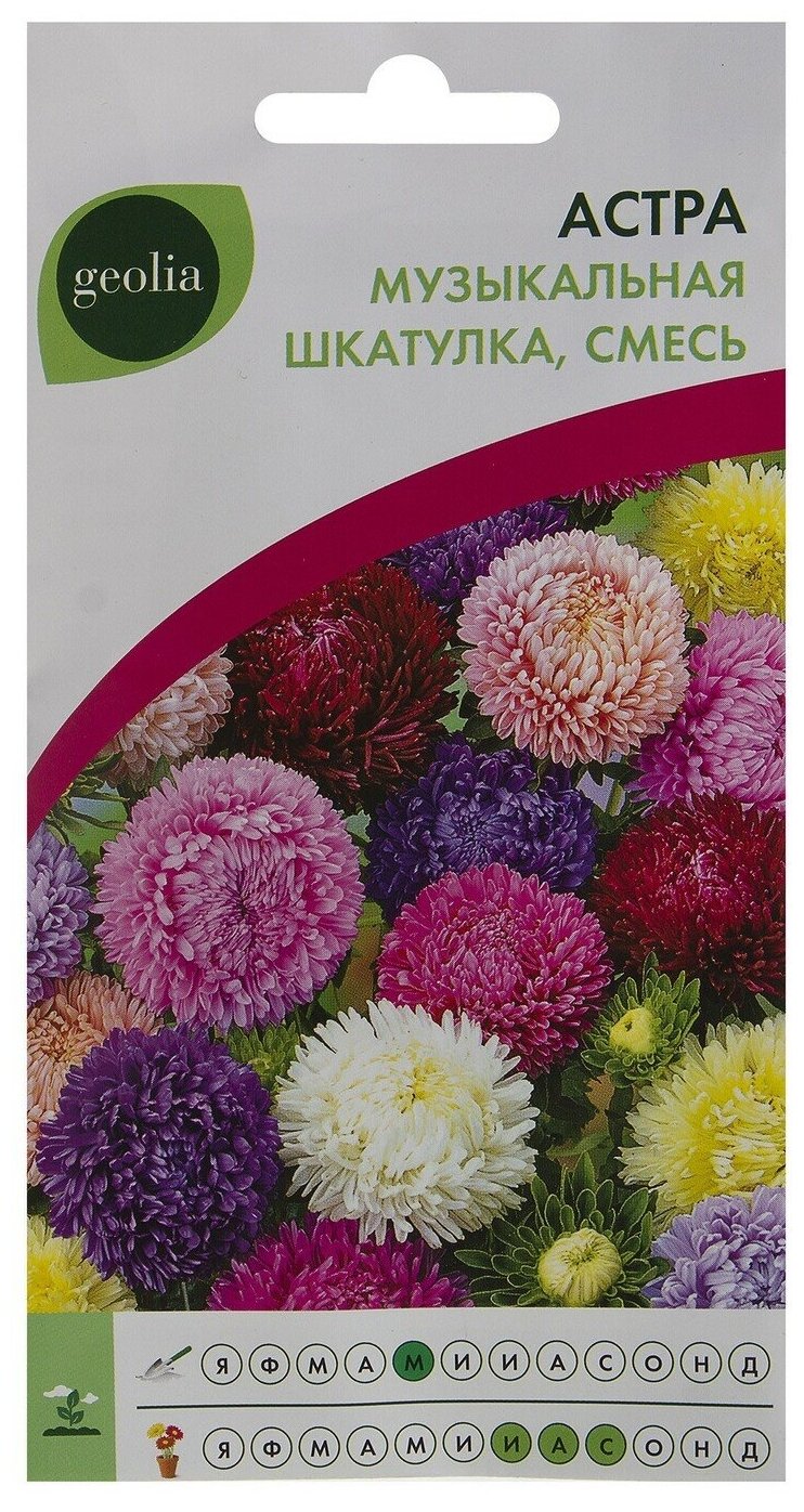 Астра Музыкальная шкатулка, Geolia, смесь окрасок – представляет собой карликовую разновидность астрочек, отличающихся продолжительным цветением. Цветы полушаровидной формы диаметром 7 см смотрятся очень изящно на компактных кустах высотой 20 см. Цветовая палитра насыщенная и разнообразная. Данная смесь великолепно подходит для выращивания в горшках, украсит клумбы, рабатки, бордюры.