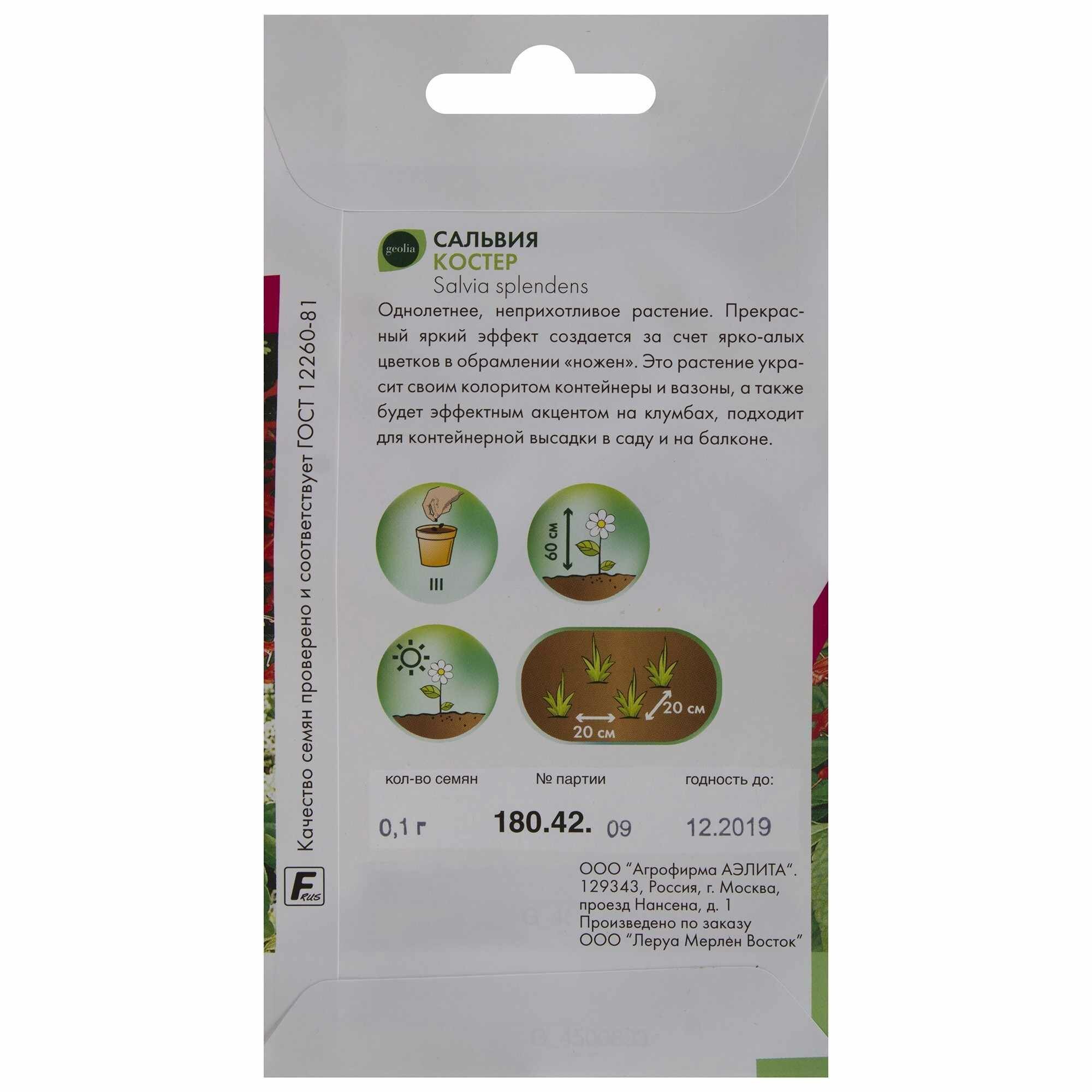 Сальвия Geolia «Костёр» — однолетнее растение с пышными ярко-красными соцветиями. Подходит для выращивания на клумбах, в вазонах и контейнерах, на балконе. Высота стеблей — до 60 см. Выращивается рассадным способом. Сальвия устойчива к засухе. Цветет с июня до поздней осени.