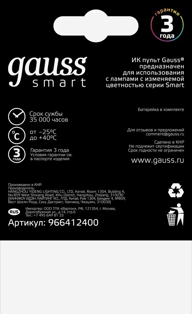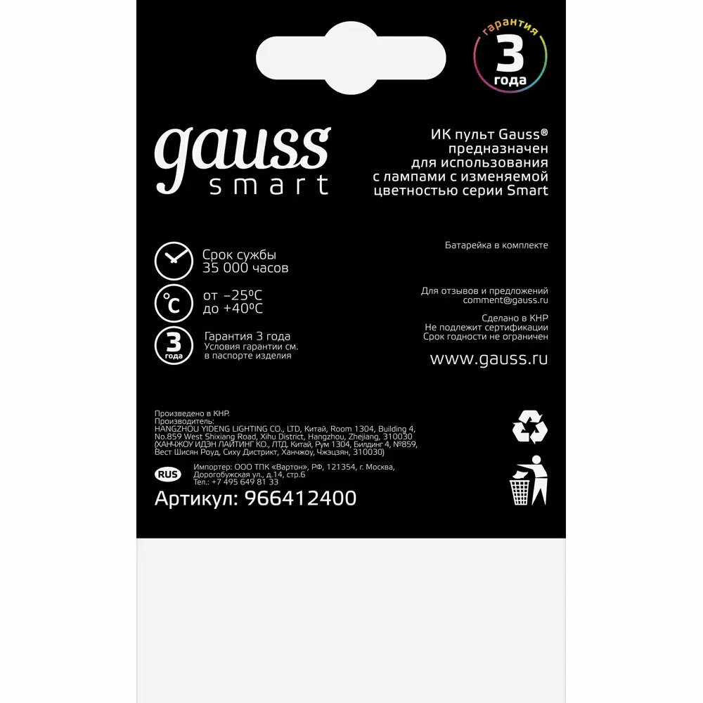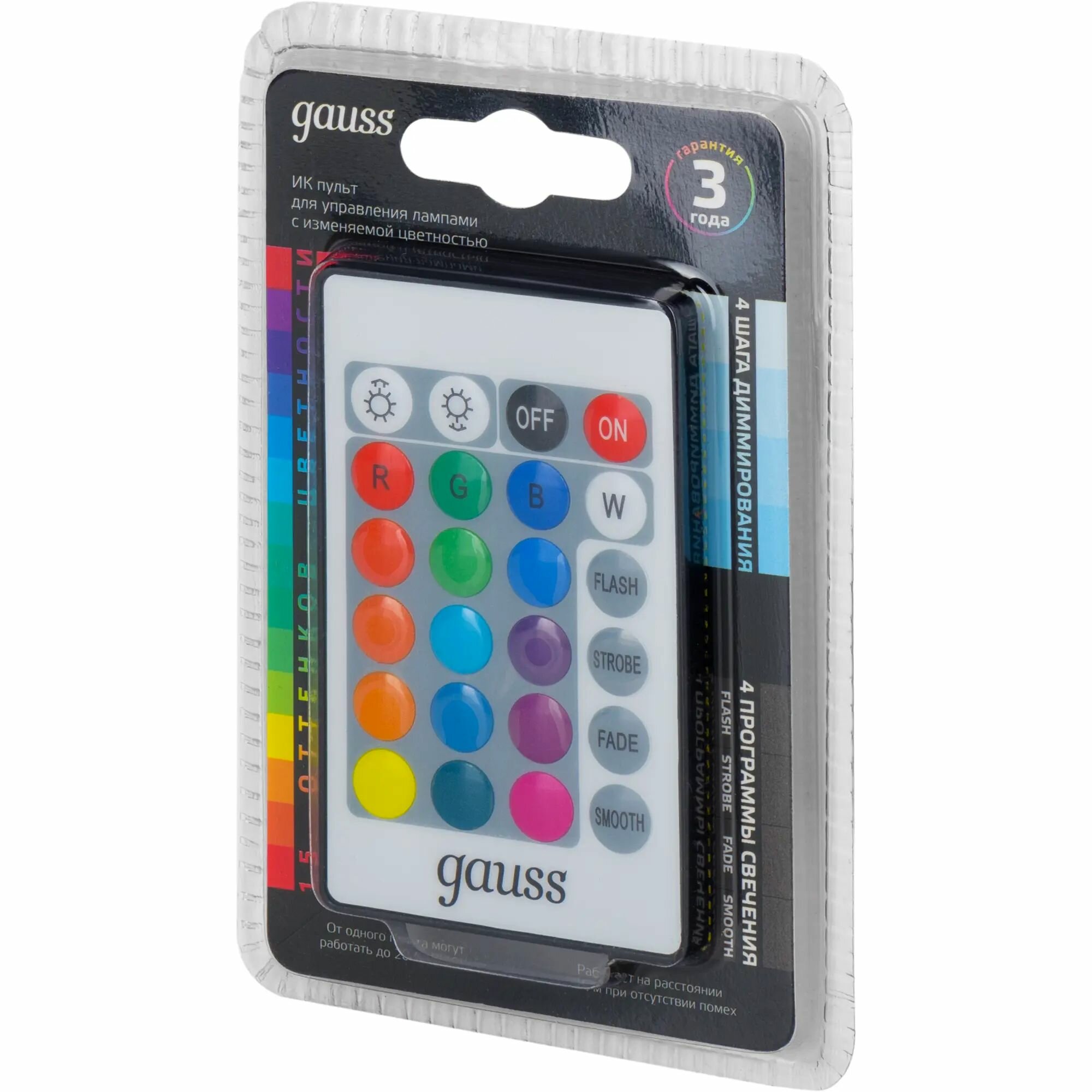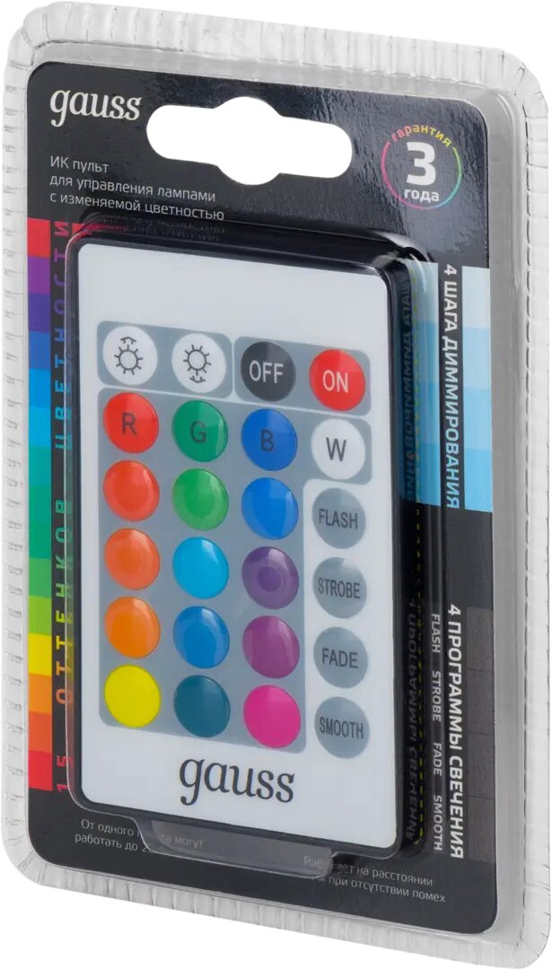 | Применение продукта | ИК пульт предназначен для управления светодиодными лампами с изменяемой цветностью Gauss серии Smart LED |