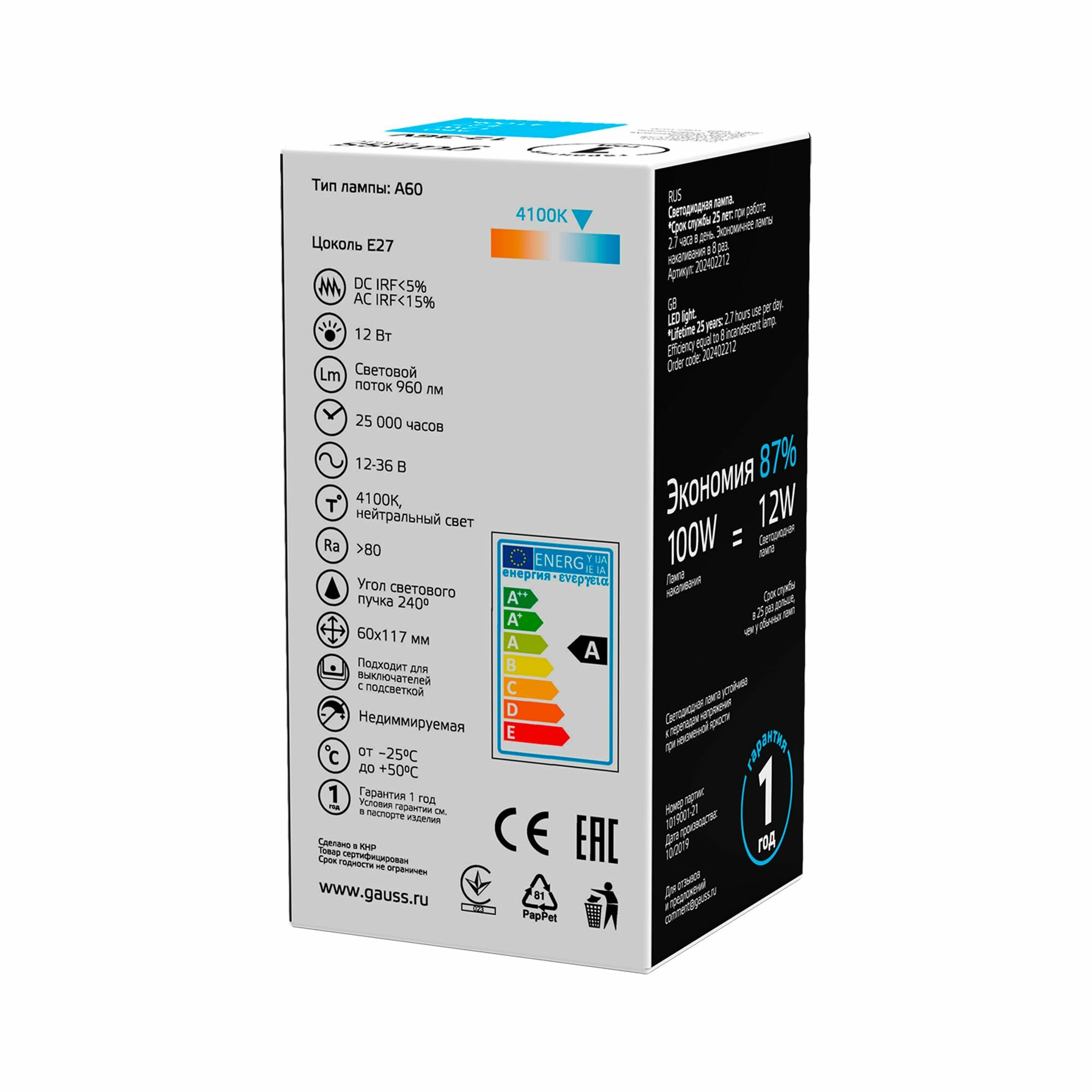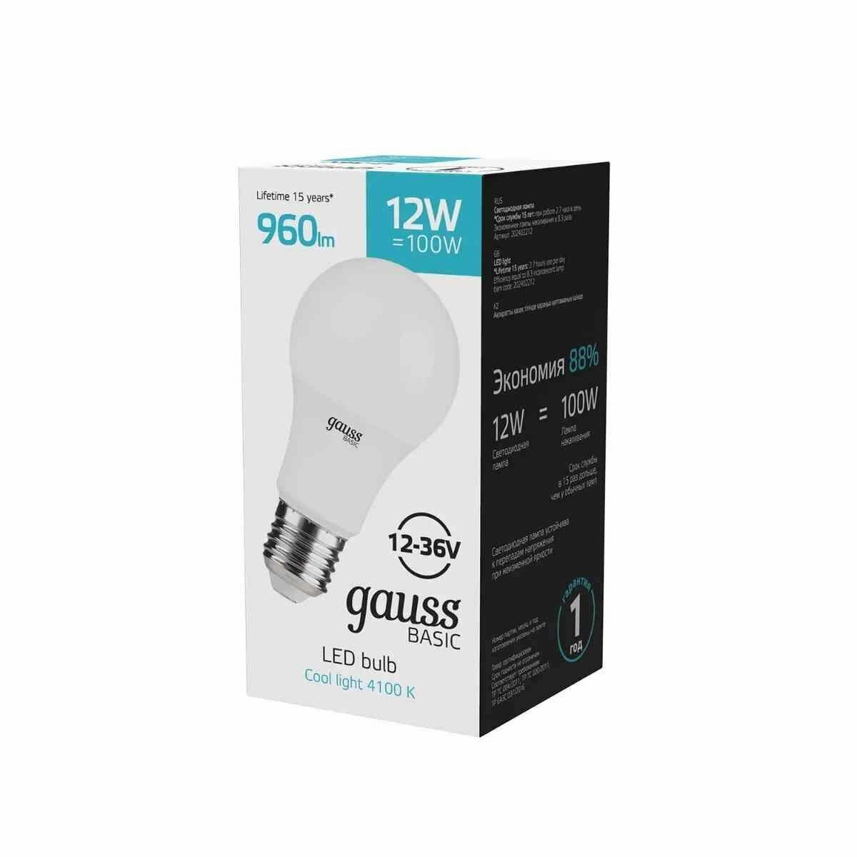 | Модель продукта | Лампа Gauss BASIC A60 12W E27 960lm AC/DC 12-36V 4100K |
