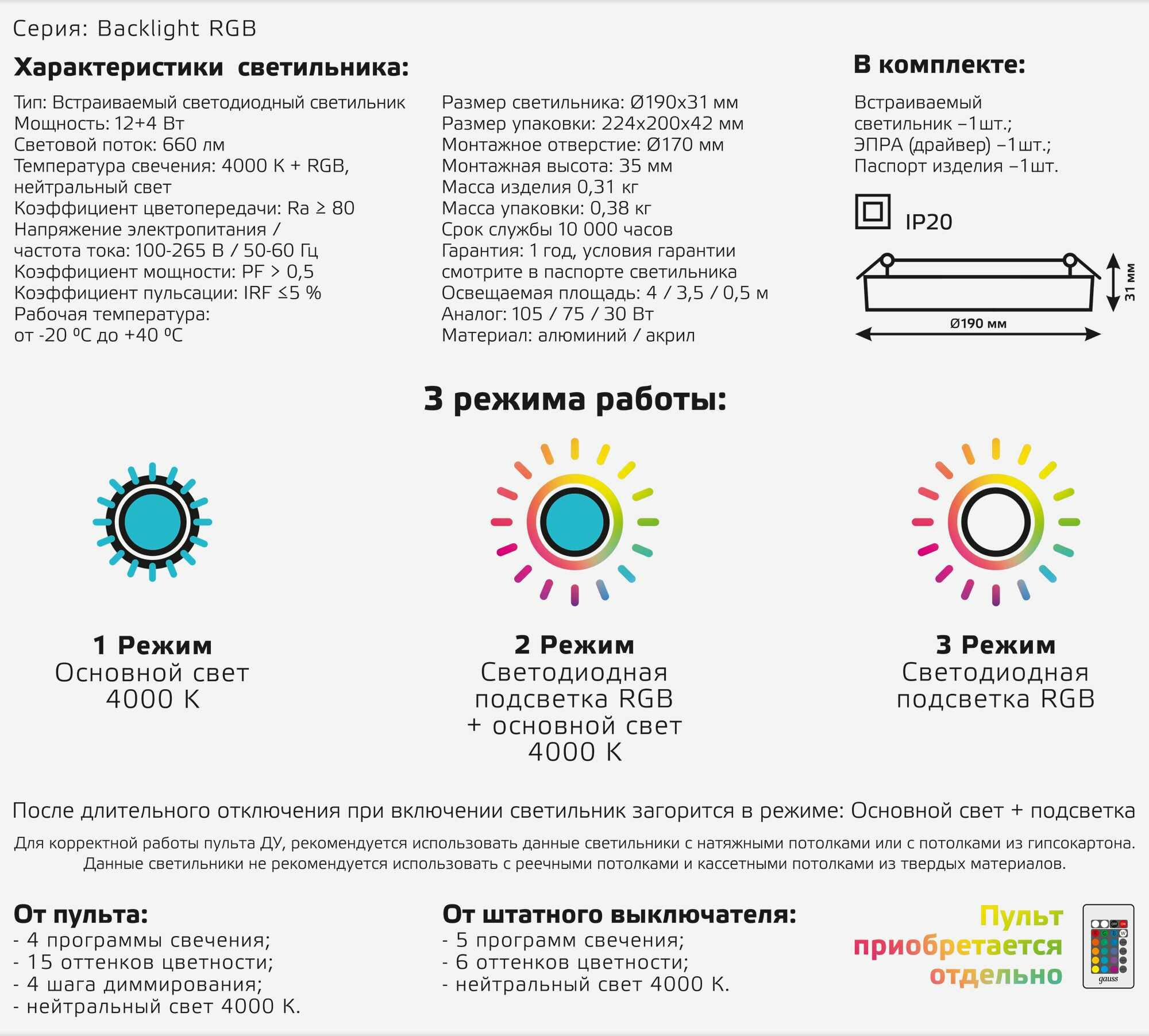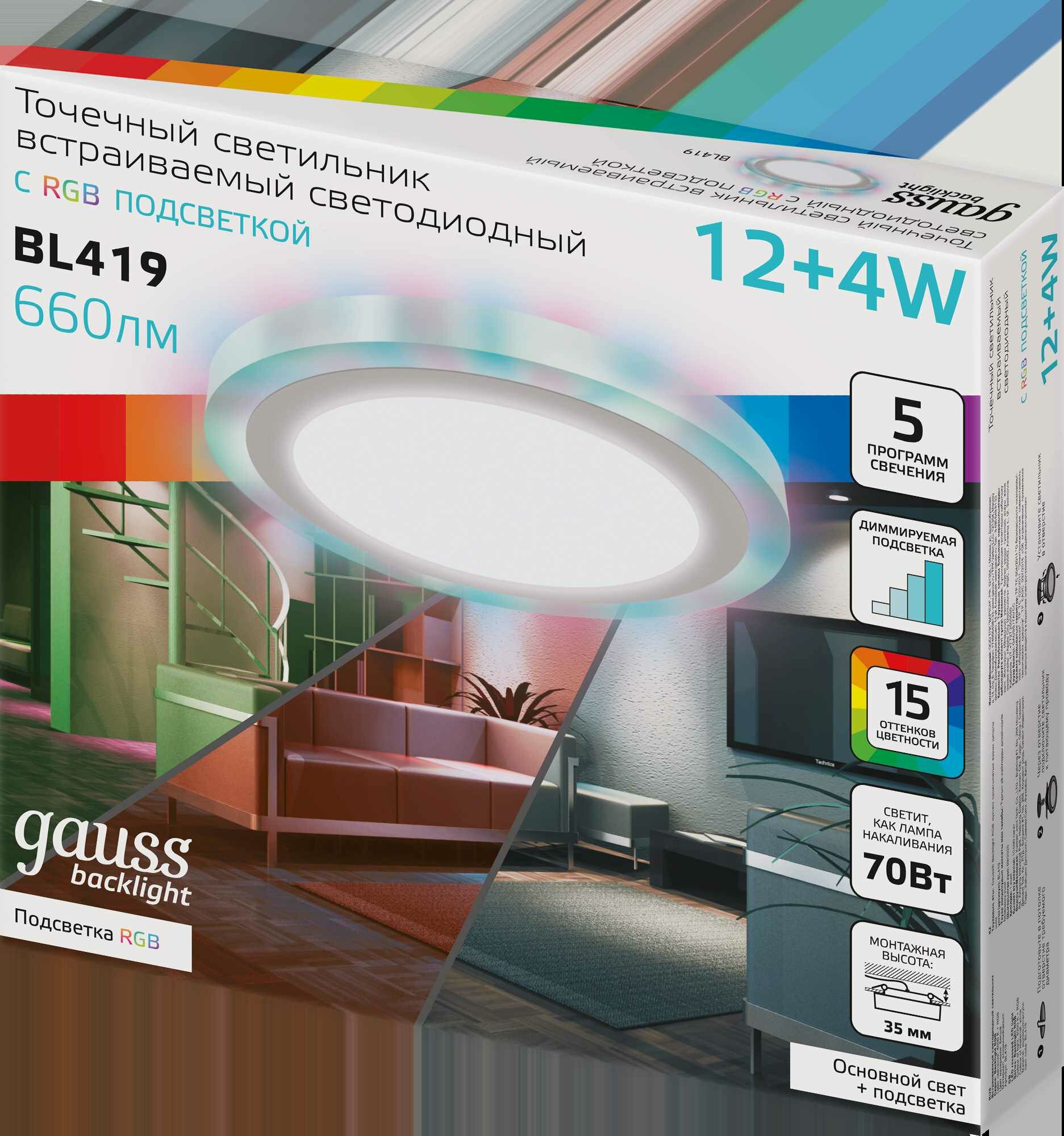 Светильник встраиваемый круглый Gauss Backlight с возможностью изменения цвета освещения позволит создать красочную, праздничную атмосферу в жилище. Может использоваться для эффектной подсветки в помещениях, освещения рекламных стендов и конструкций, а также для сопровождения различных мероприятий. Светильник представлен в корпусе из алюминия и акрила. Расчет количества светильников производится исходя из площади комнаты: 1 прибор на 2,25 м². Кроме основного LED-элемента с мягким дневным светом и цветовой температурой 4000 K изделие имеет дополнительную RGB-подсветку. Общая потребляемая мощность — 9 Вт.