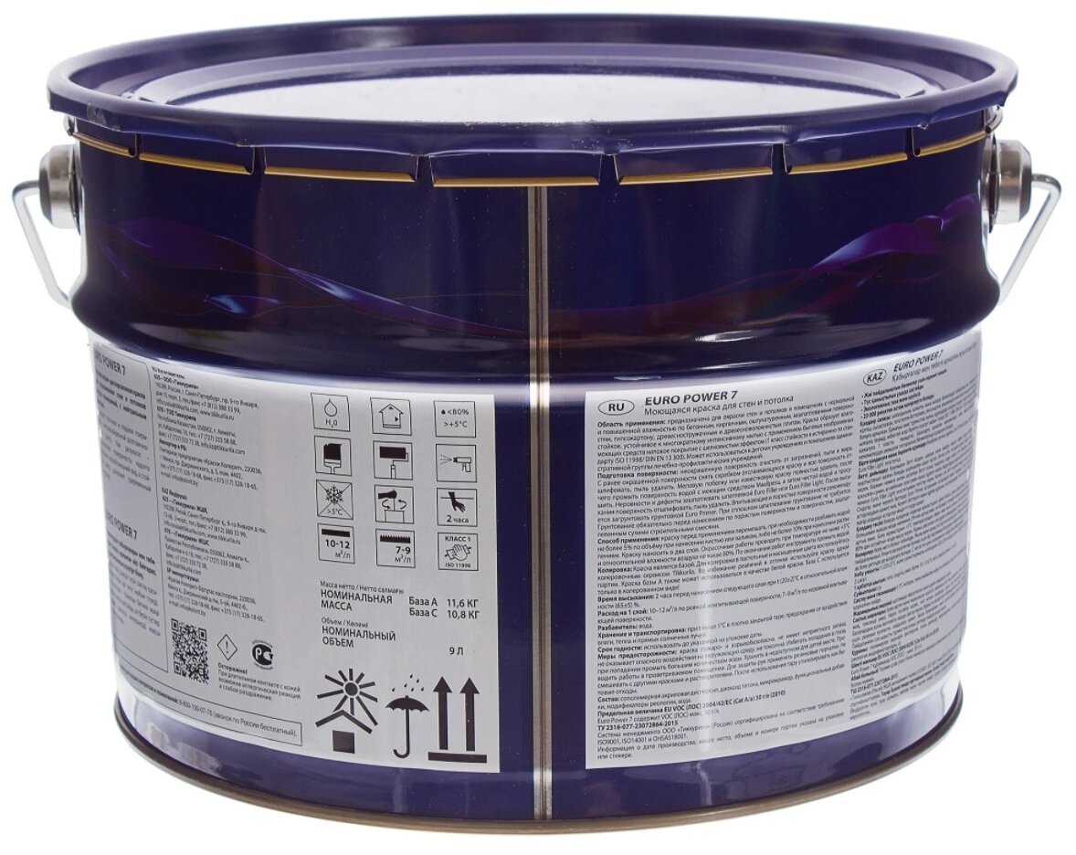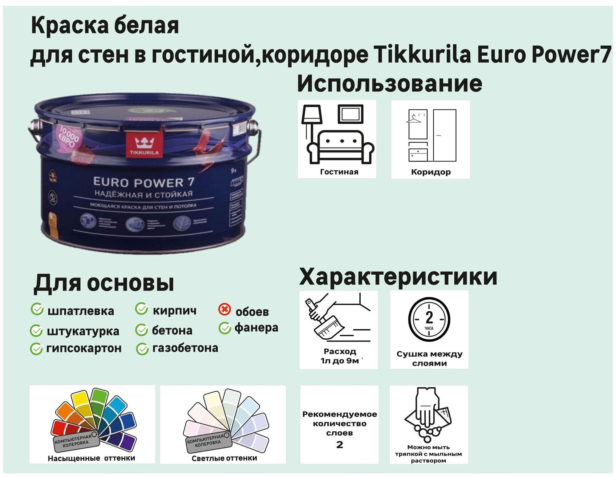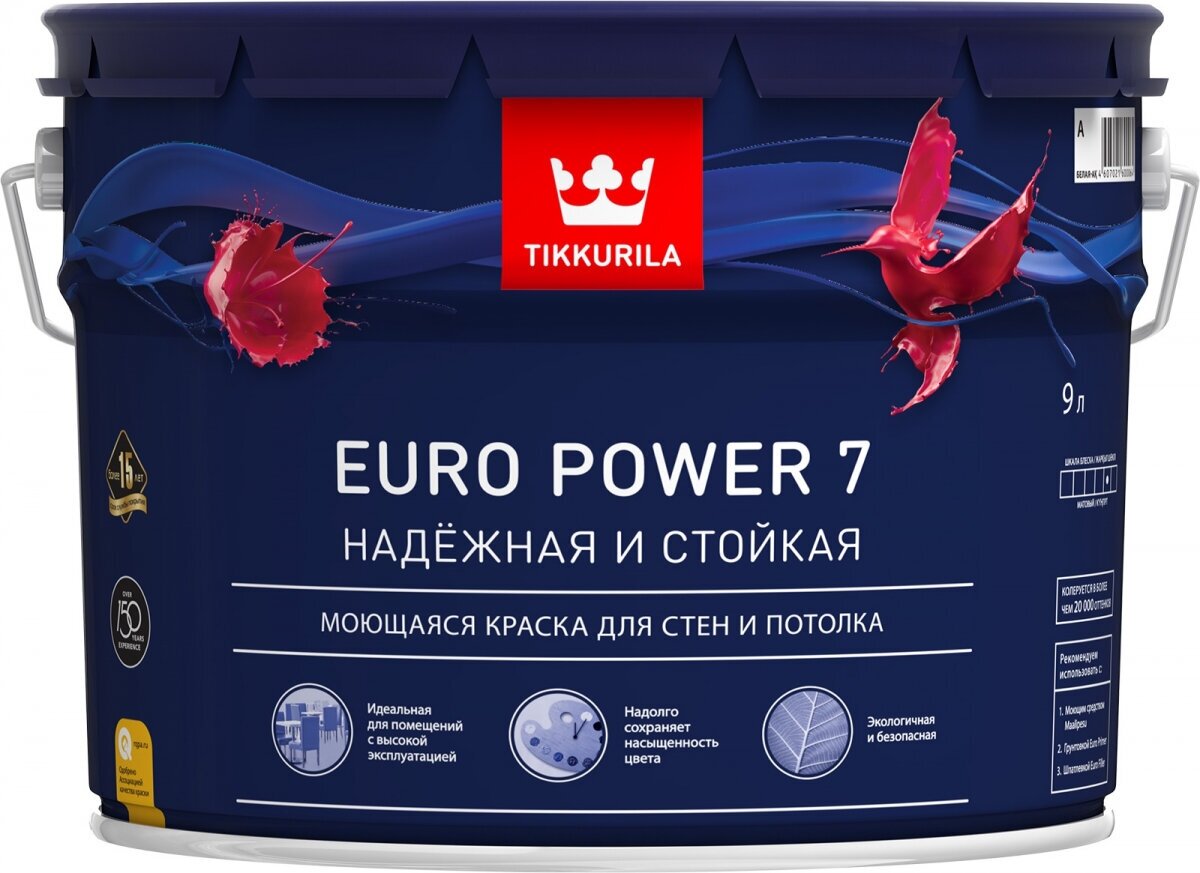 Краска водно-дисперсионная Тиккурила Евро 7 база С, 0,9 л — отделочный материал, предназначенный для внутренних работ. Не содержит вредных для здоровья веществ, отличается небольшим расходом при нанесении на ровные невпитывающие поверхности — 10–12 м²/л.