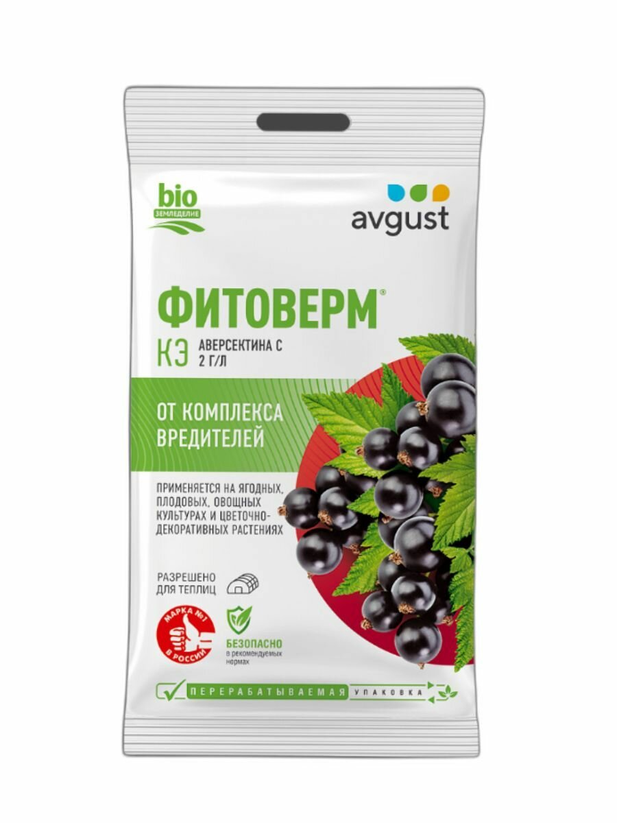 Биопрепарат «Фитоверм» от вредителей подходит для защиты плодово-ягодных, овощных и декоративных культур, а также комнатных цветов. Вредители начинают погибать уже через 6-8 часов. Срок защитного действия — до 20 дней.