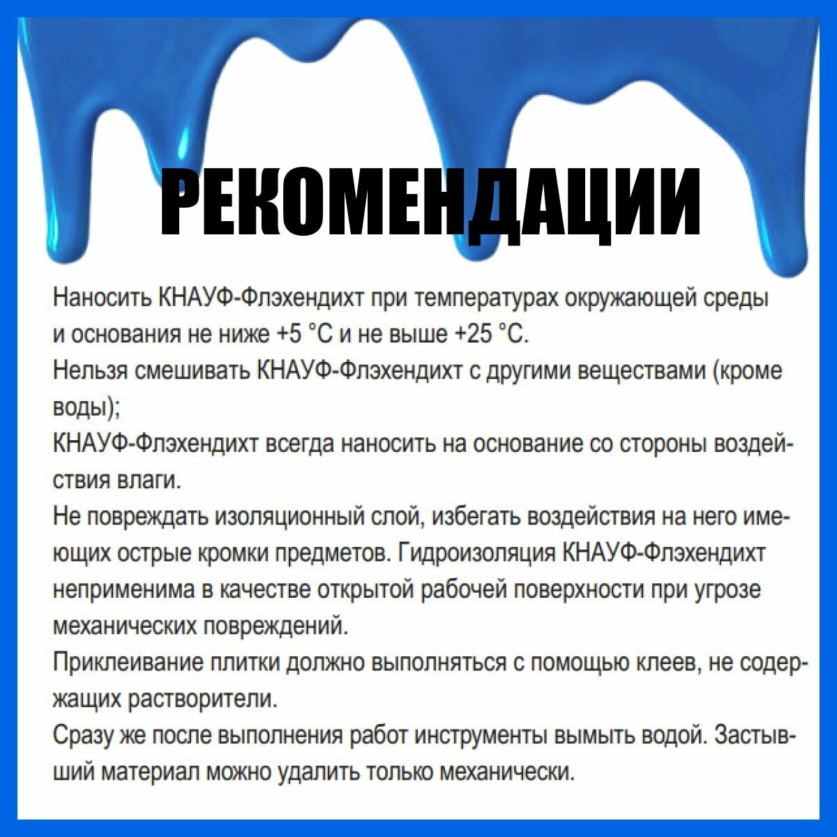 Гидроизоляция без битума «Кнауф-Флэхендихт» представляет собой эмульсию голубого цвета с хорошей степенью адгезии к бетону, известковой штукатурке, кирпичной кладке и другим основаниям. Материал применяется для гидроизоляции влажных и сырых помещений, чувствительных к влаге или гигроскопичных оснований, а также при подготовке водонепроницаемой поверхности перед укладкой керамической плитки. Благодаря отсутствию в составе растворителей состав безопасен для здоровья человека.