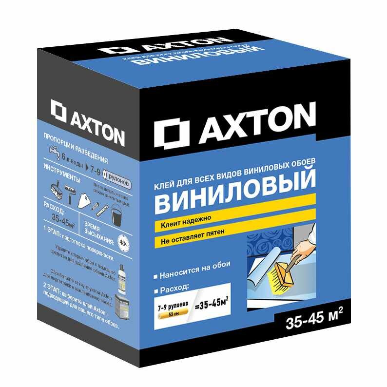 Клей для виниловых обоев Axton — адгезионная смесь, используемая в отделочных работах. Предназначена для работы с виниловыми обоями на бумажной основе и подходит для использования со вспененными, рельефными, структурными, текстильными обоями и полотнами с шелкографией. Концентрированная формула отличается высокой клеящей способностью, так как надежно удерживает тяжелые обои на стенах. Сухая смесь быстро растворяется в простой воде комнатной температуры, а для замешивания не требуются специальные навыки. Готовый клей легко наносится на полотно обоев, а получающийся скользящий слой дает возможность регулировать положение полотна на стене и формировать стыки так, как это нужно. Смесь без цвета и запаха не оставляет пятен. Безопасная формула не вредит здоровью. Упаковка рассчитана на 7-9 рулонов. Расход ― 35-45 м^2^.