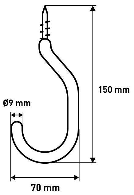 Крючок рассчитан на нагрузку до 50 кг, поэтому подходит для удерживания тяжелых инструментов. Диаметр каркасной трубы составляет 9 мм. Ширина изделия ― 70 мм, высота ― 9 мм, а глубина ― 150 мм. Корпус выполнен в красном цвете. На товар предоставляется гарантия сроком 1 год.