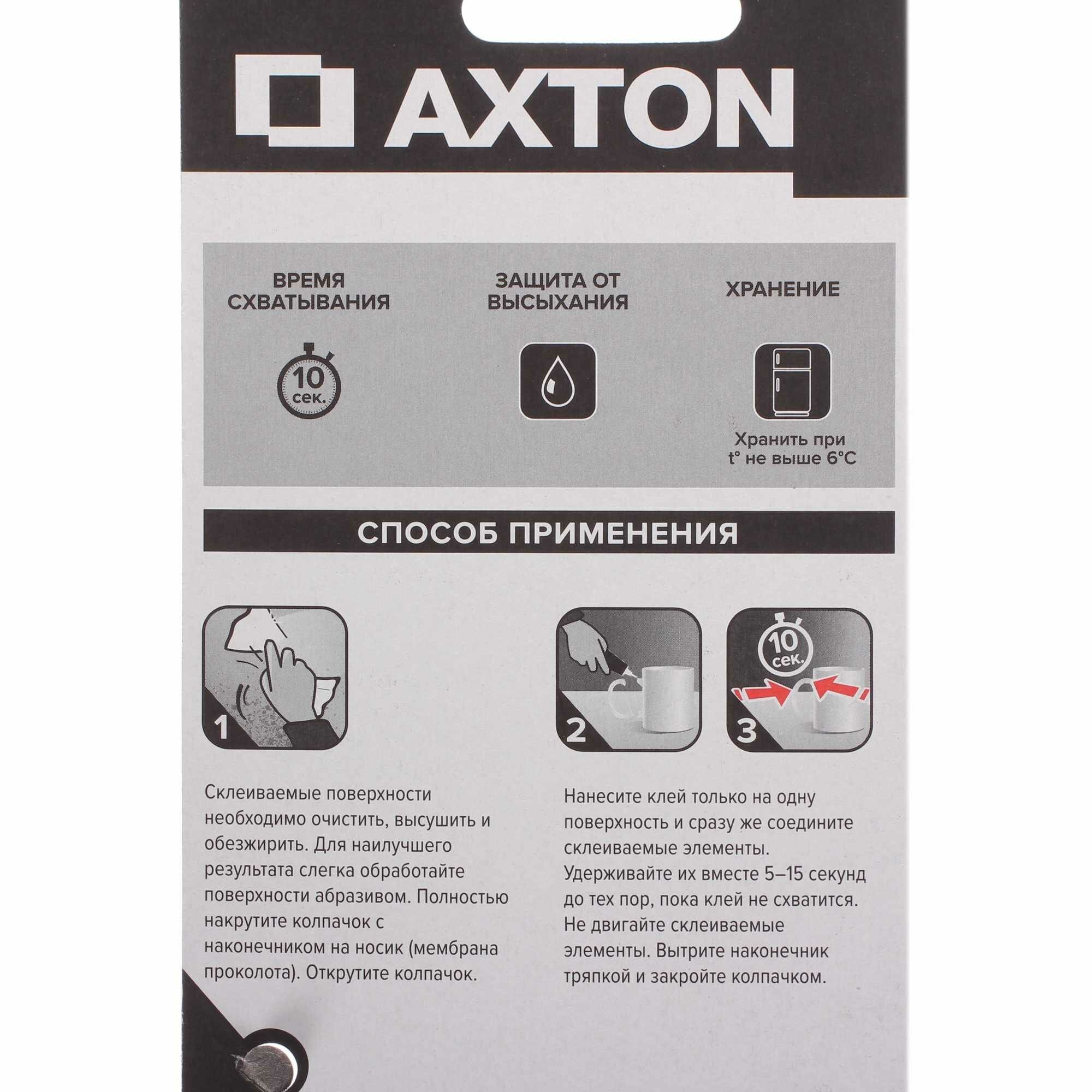 Суперклей Axton — прозрачный клеящий гель на основе цианоакрилата. Предназначен для ремонта и соединения недеформируемых материалов: металлов, стекла, дерева, большинства видов пластика. Подходит для приклеивания к жестким основаниям изделий из кожи, ткани, бумаги, резины. Может использоваться для работ снаружи и внутри помещения. Страна производства товара — Китай.
