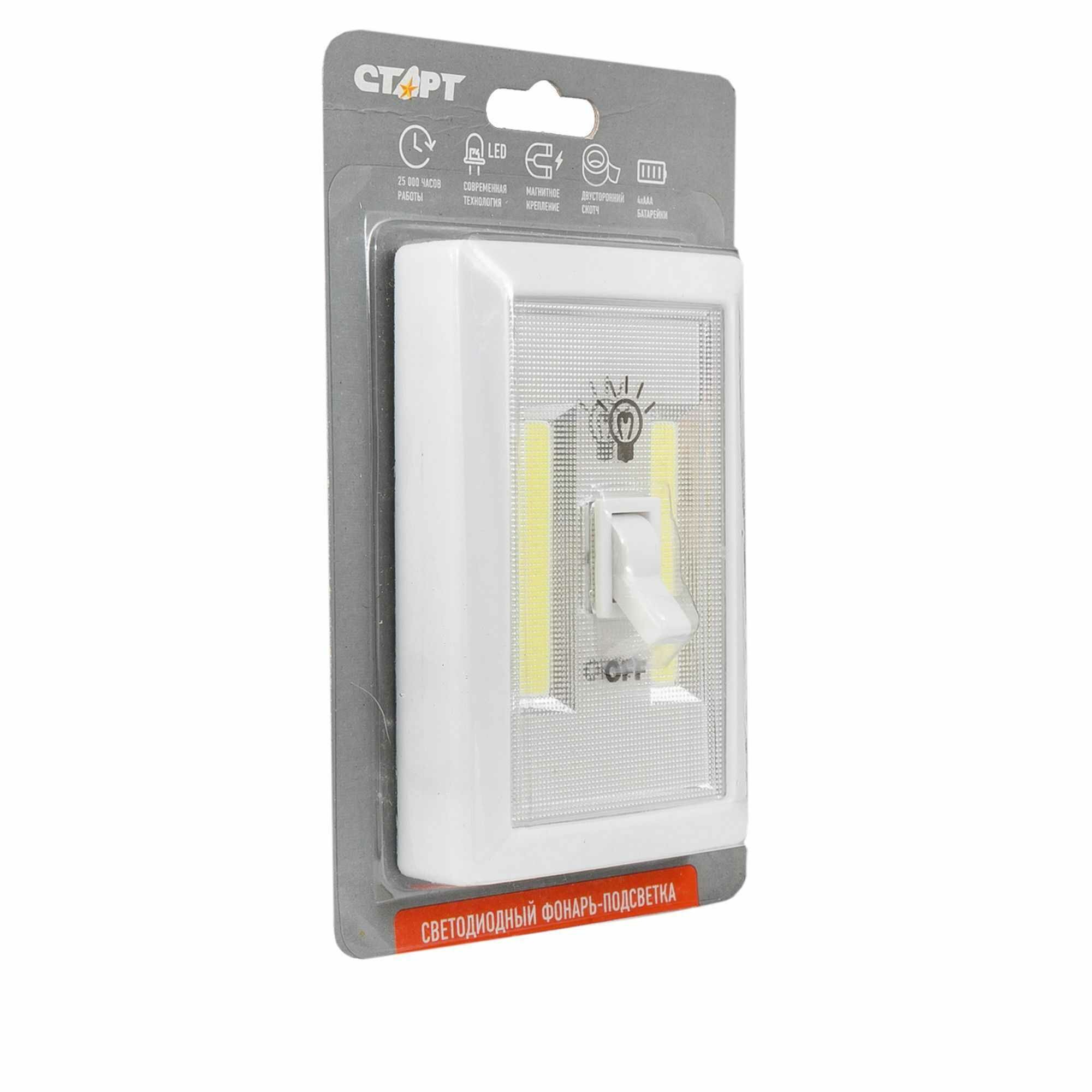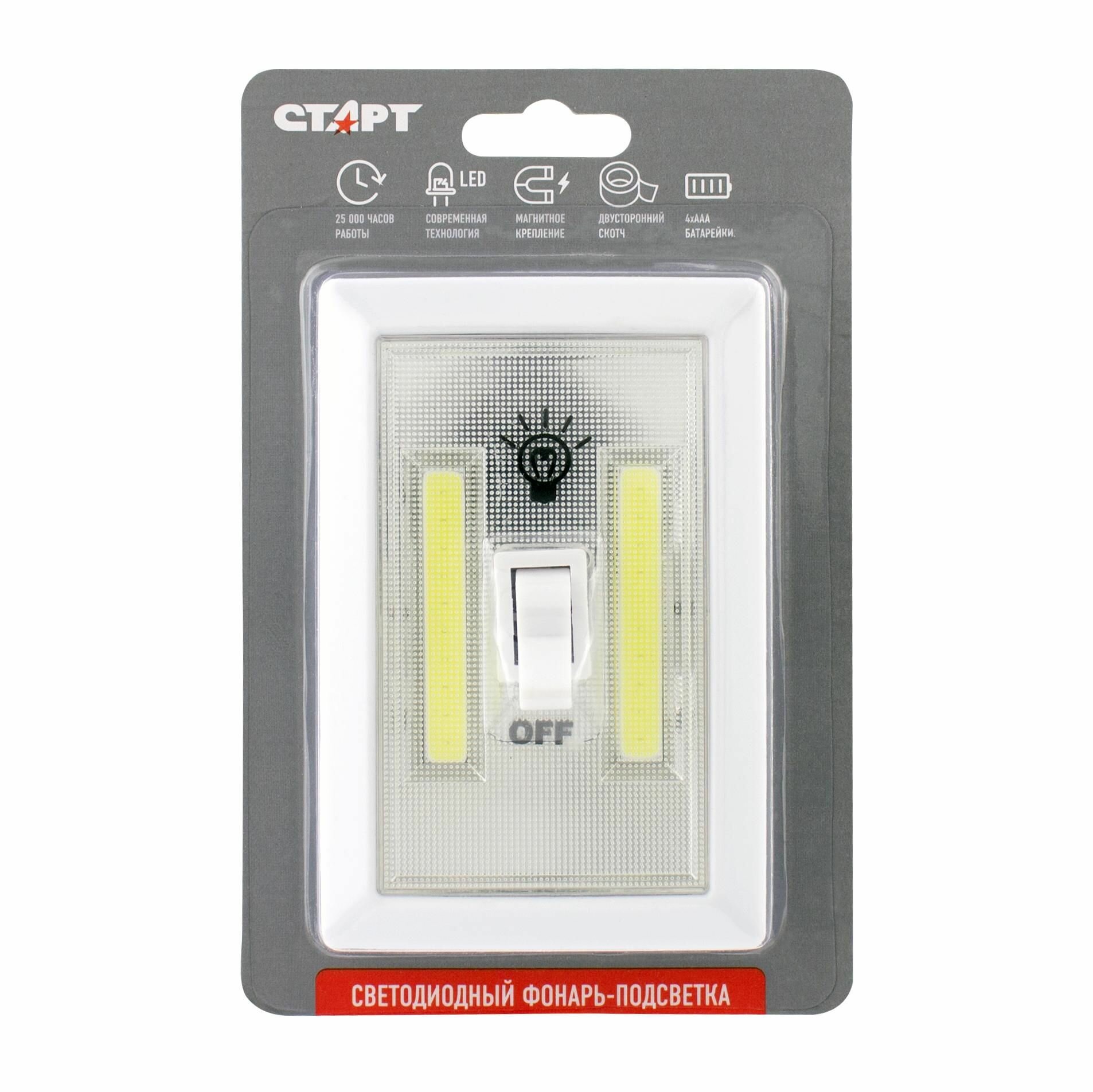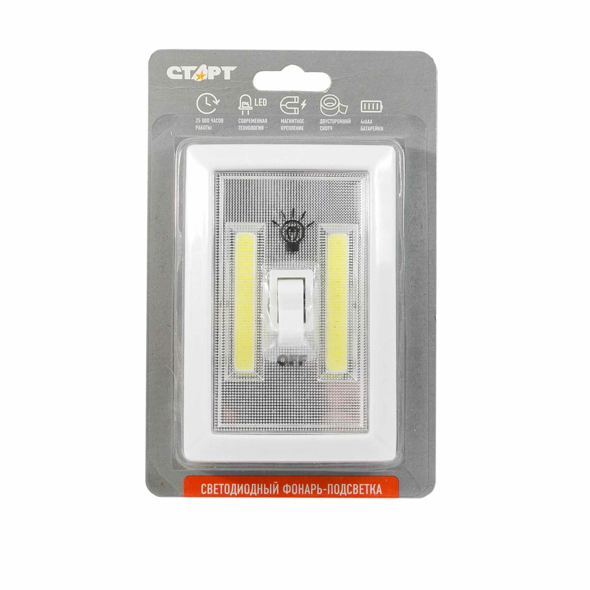 Выполненный в виде обычного квадратного выключателя миниатюрный светильник СТАРТ PL-2LED-COB работает от двух LED ламп, приводимых в действие четырьмя «мизинчиковыми» (AAA) батарейками. Использованная в светодиодах инновационная технология COB (Chip-on-Board) делает свет пушлайта особенно ярким.