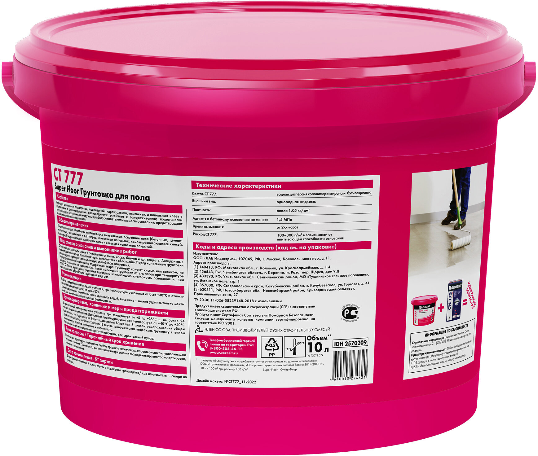 Грунтовка глубокого проникновения Ceresit Super Floor водно-дисперсионная смесь для эффективной обработки минерального основания пола. Совместима с бетоном, кирпичом, газобетоном, гипсом, деревом, OSB. Применяется для подготовки поверхности перед нанесением напольных материалов: самовыравнивающиеся смеси, плиточные клеи, клеи для финишных напольных покрытий.