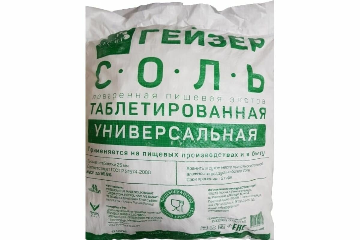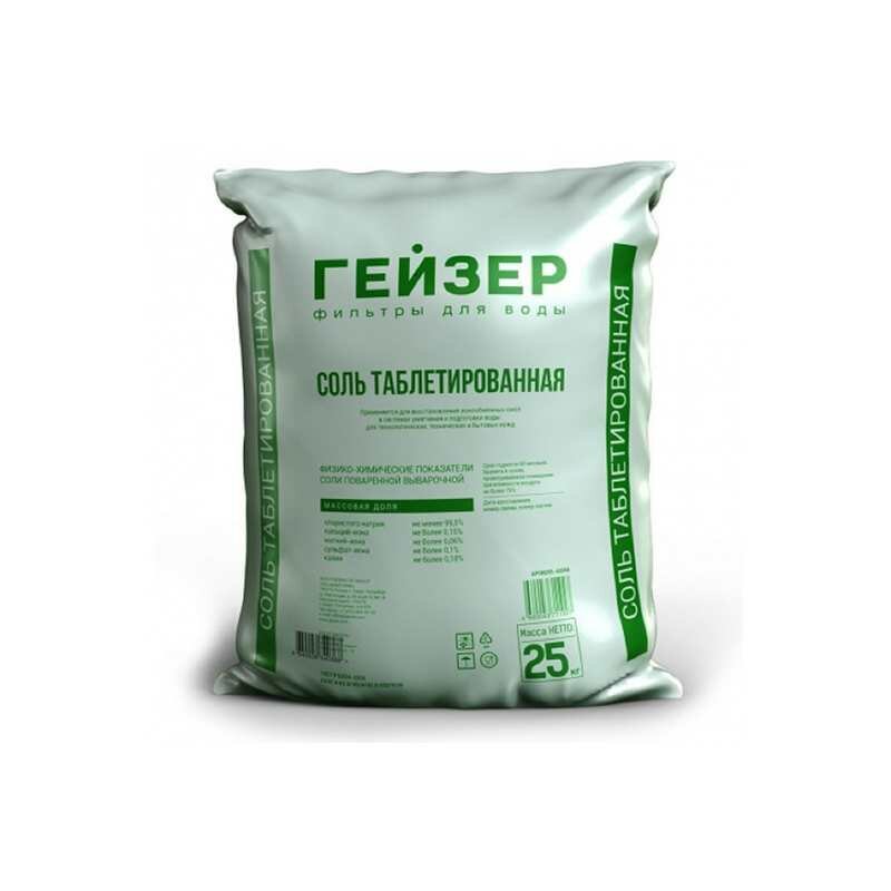 Назначение соли таблетированной российского бренда «Гейзер» – улучшение работы фильтров и установок для смягчения воды, восстановление ионообменных смол. Продукт препятствует образованию накипи и известковых отложений благодаря замене ионов кальция и магния на ионы натрия. Используется при подготовке воды для технических, технологических и бытовых нужд.
