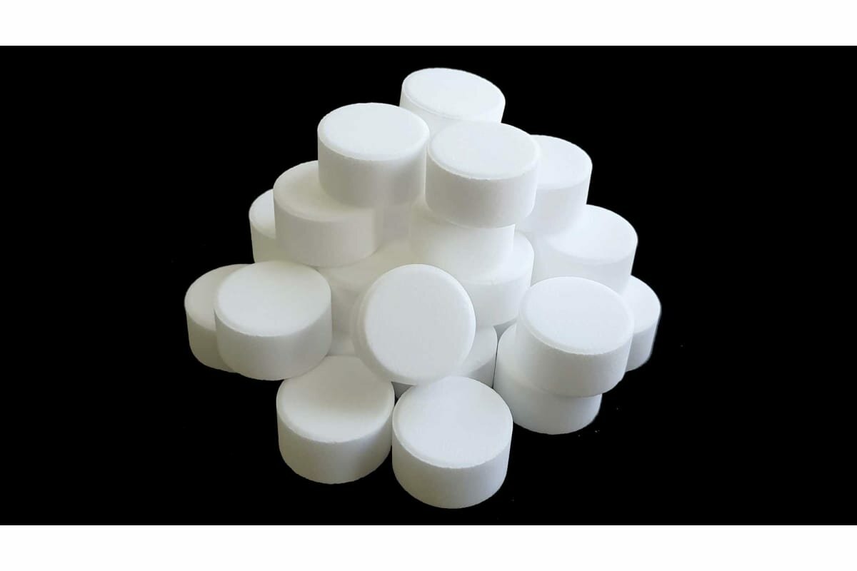 Не кристаллизуется и не образует осадок, растворяется постепенно и равномерно. Изготовлена в соответствии с ГОСТом в виде стандартных круглых таблеток. При правильном хранении срок годности – 60 месяцев. Выпускается в мешках по 25 кг.