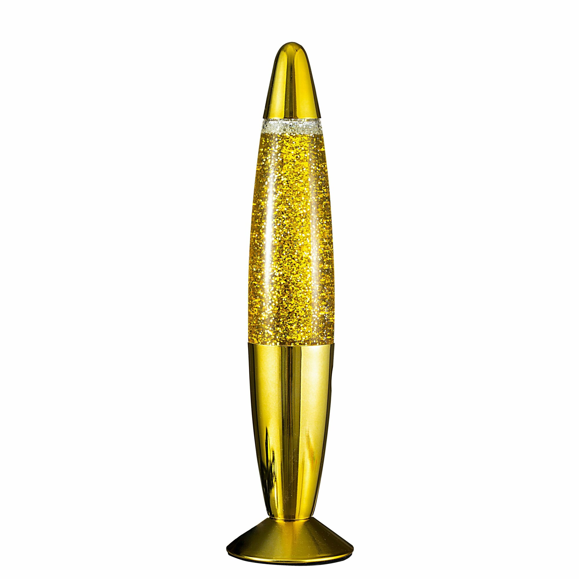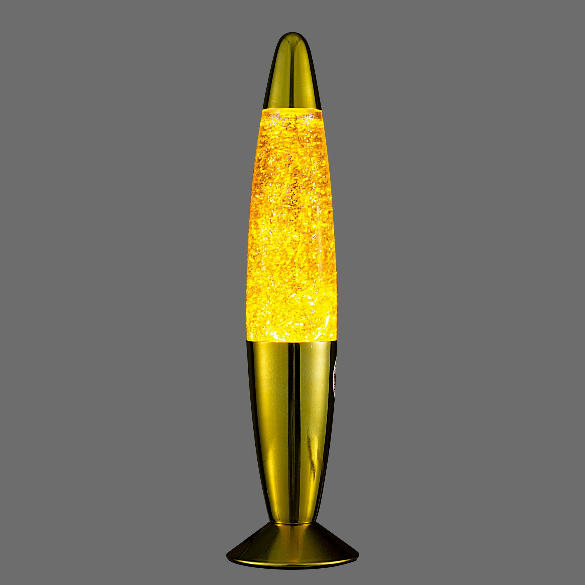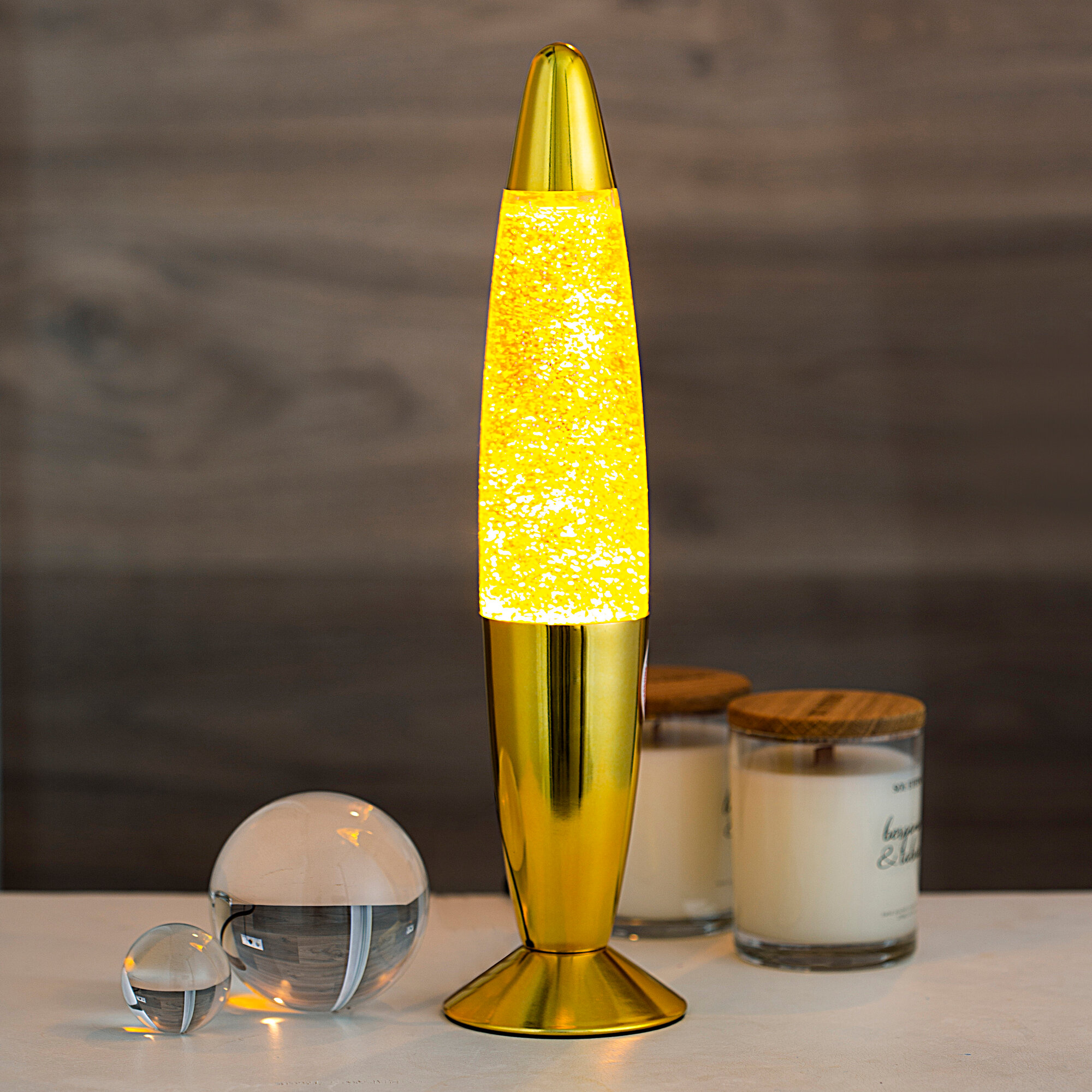 В неработающем светильнике глиттеры собраны на дне колбы и начинают подниматься вверх, когда ночник включен. Всё более быстрое перемещение разноцветных блёсток в золотистом светящемся стекле создаёт потрясающий визуальный эффект.