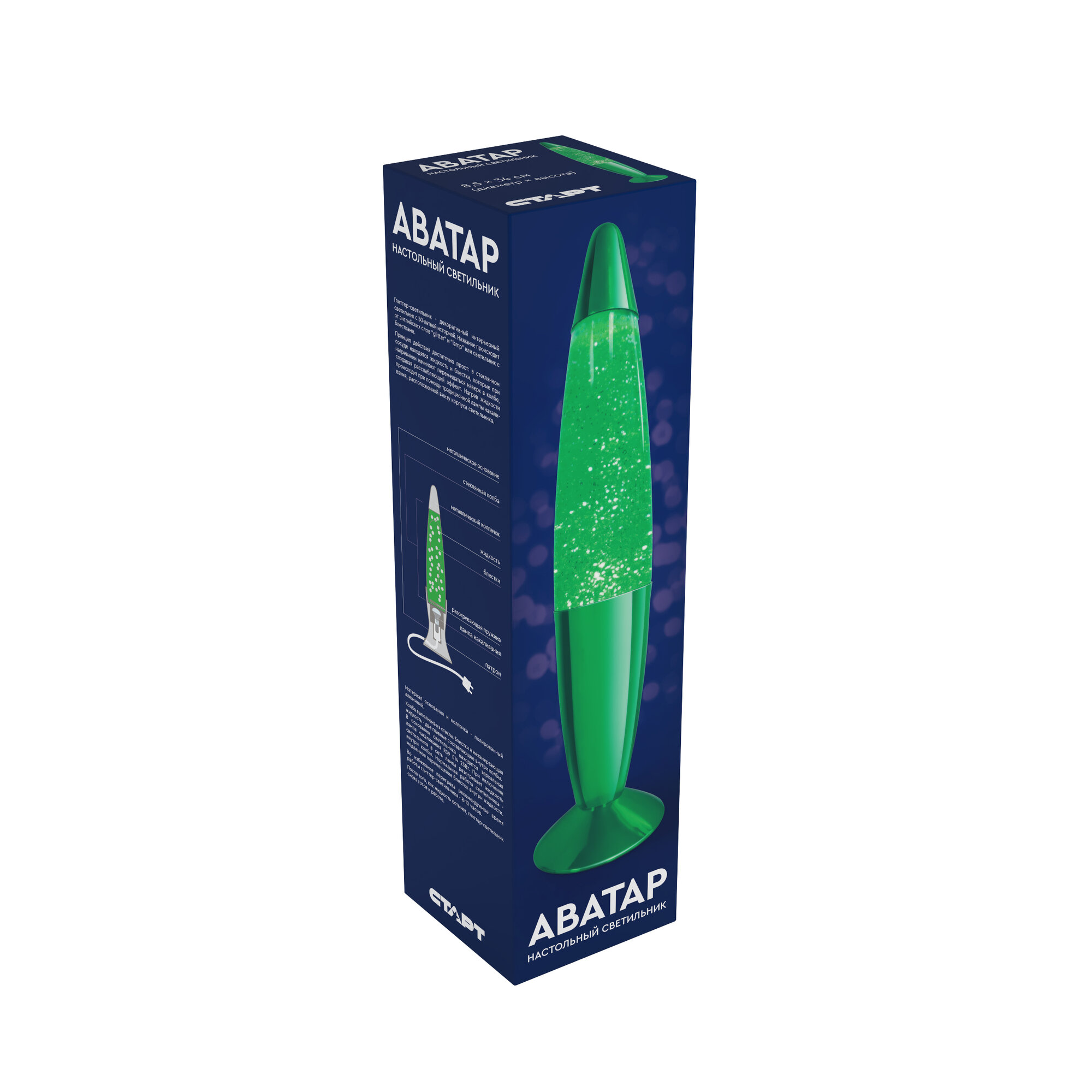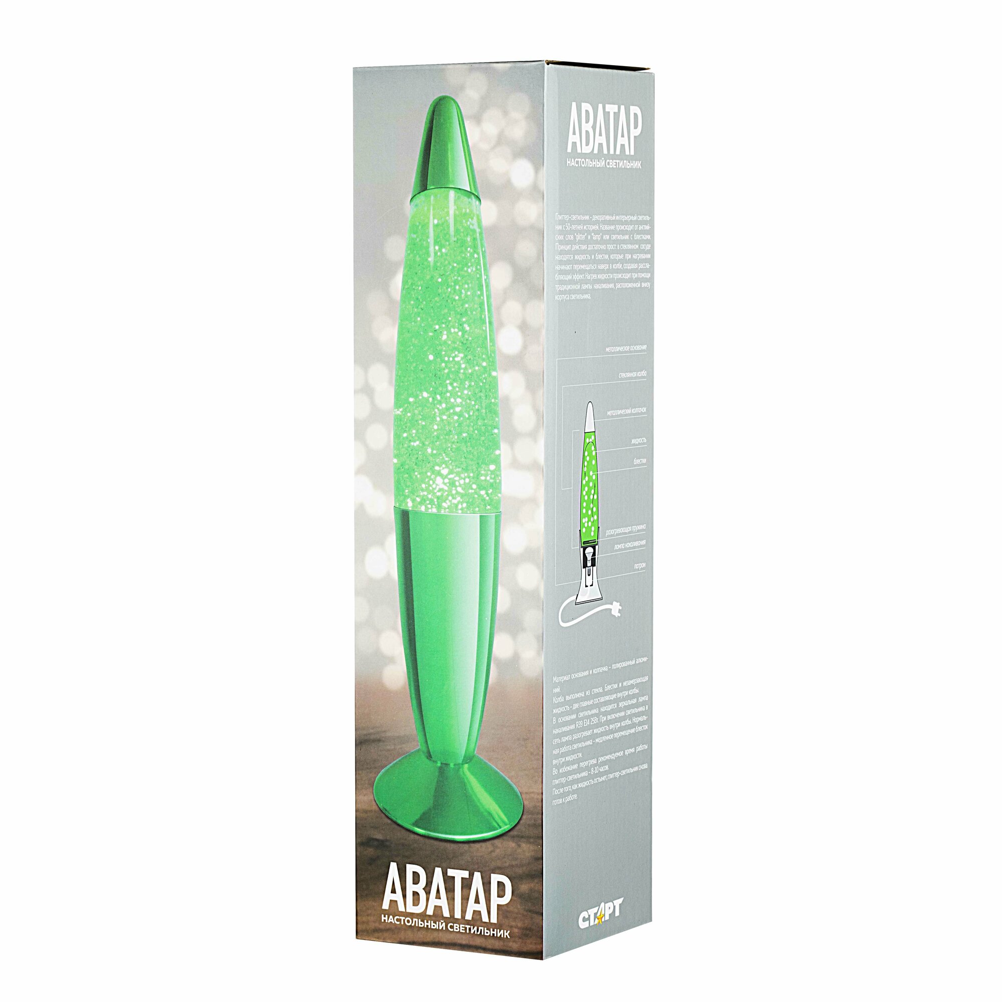 Настольная лампа Старт «Аватар» - декоративный светильник с жидкостью, заполняющей полупрозрачный корпус устройства, с зелеными блёстками.