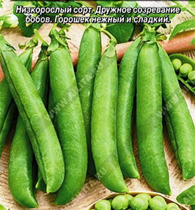 Среднеспелый лущильный сорт (61-70 дней от полных всходов до технической спелости горошка). Стебель длиной 40 см. Бобы слабоизогнутые с острой верхушкой, длинные, широкие, в технической спелости зеленые. Горошек зеленый, с нежным и очень сладким вкусом. Созревание бобов дружное. Рекомендуется для использования горошка в свежем виде, кулинарии и для консервирования.