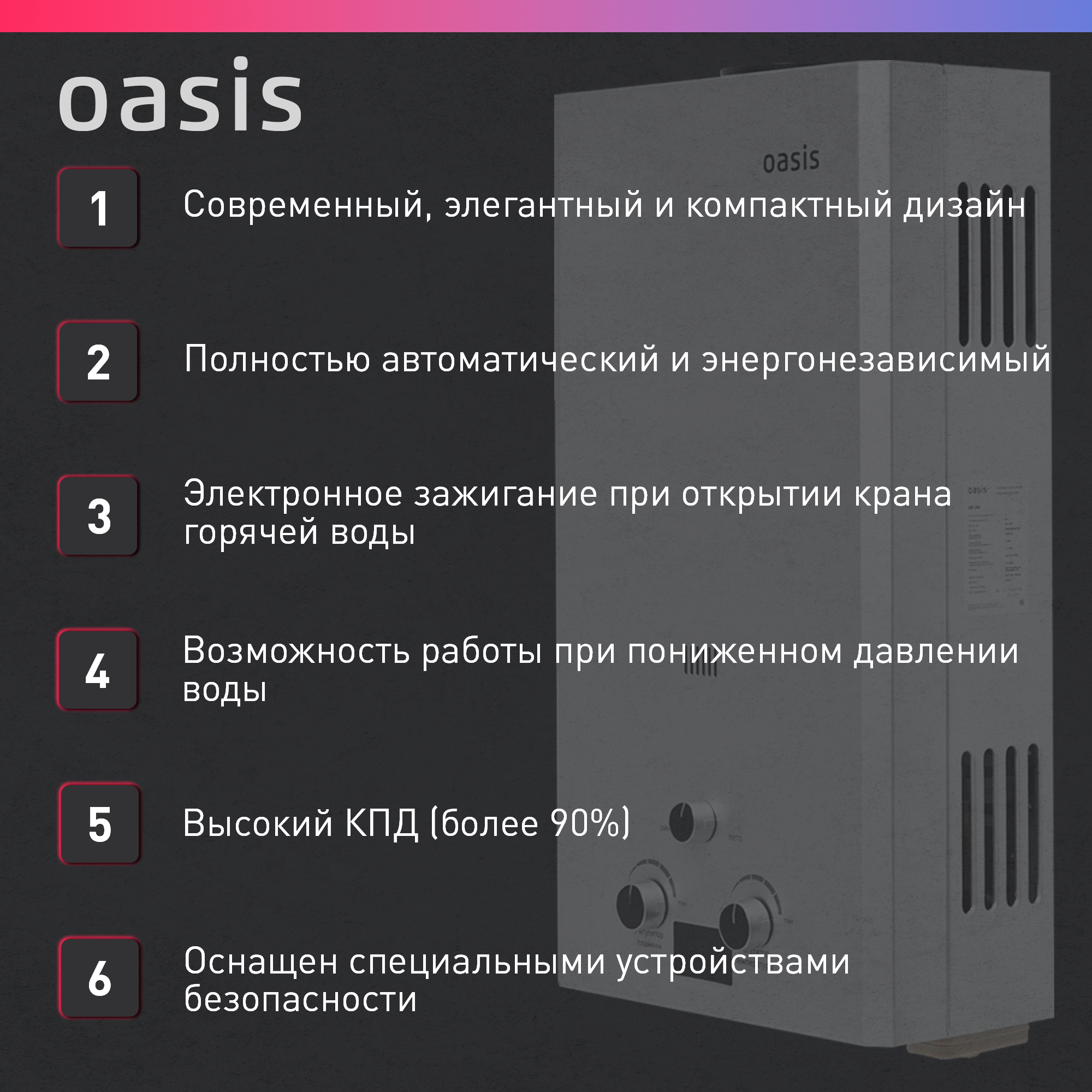 Стальная газовая колонка OASIS в настенном исполнении с расчетной мощностью непрерывного нагрева воды 10 л/м для эксплуатации в помещениях, оборудованных дымоходом. Работает от стационарной газовой сети. Оснащена системой электрического розжига горелки от встроенного пьезоэлемента, работающего от аккумуляторной батарейки (отсутствует постоянно горящий запальник).