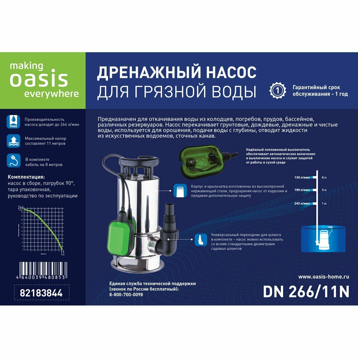 Насос погружной дренажный для грязной воды Oasis DN266/11N 15960 л/час (DN 266/11N)