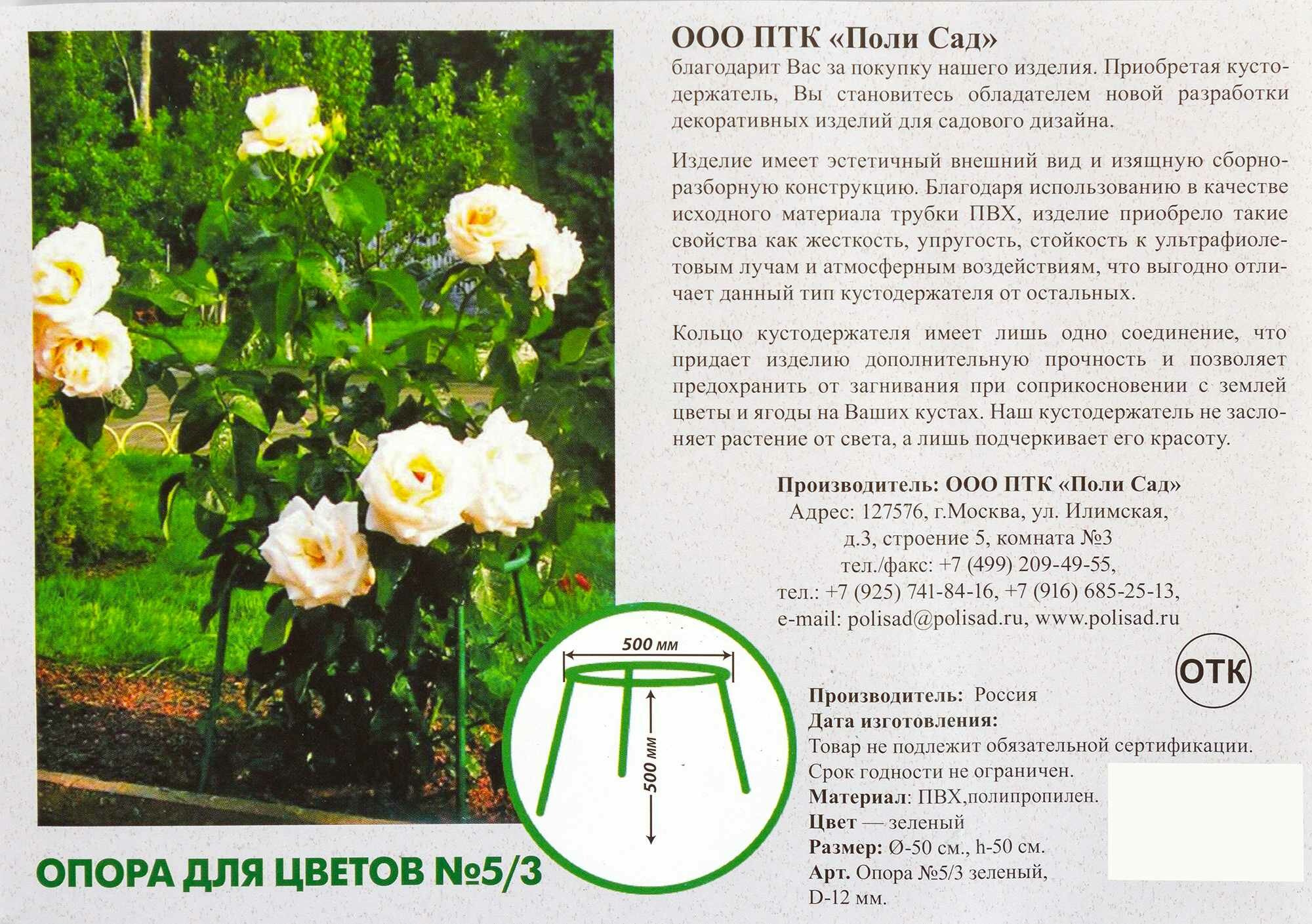 Держатель для растений №5 российского производства изготовлен из ПВХ. Материал устойчив к воздействию ультрафиолетового излучения, атмосферных осадков, а также растворов солей, щелочей, минеральных удобрений.