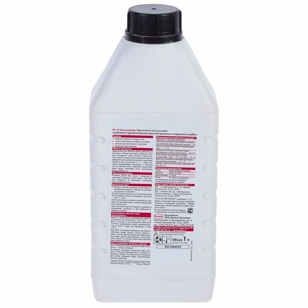 Грунтовка Ceresit CT17 — вещество для подготовки поверхностей к покраске или отделке. Наносится первым слоем на традиционный, легкий или ячеистый бетон, гипсовые и известняковые штукатурки, кирпичные кладки, плиты на древесностружечной или волокнистой основе, гипсокартон.