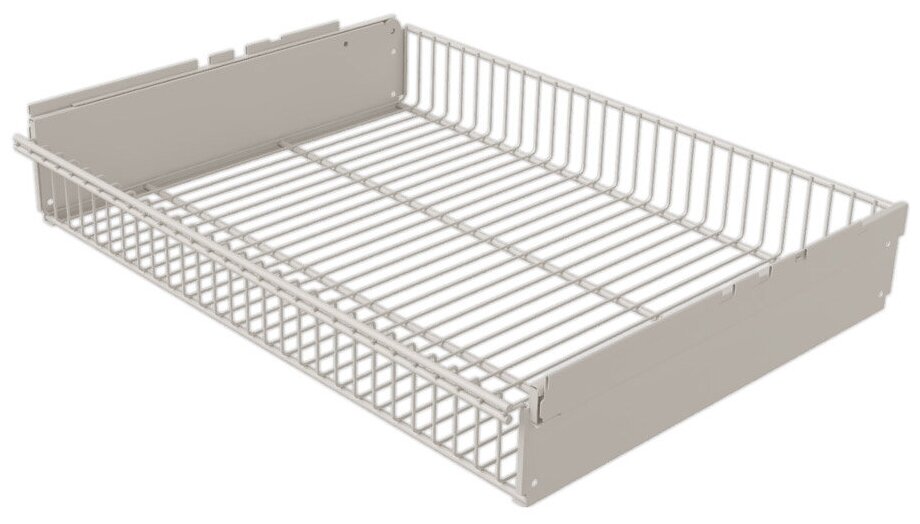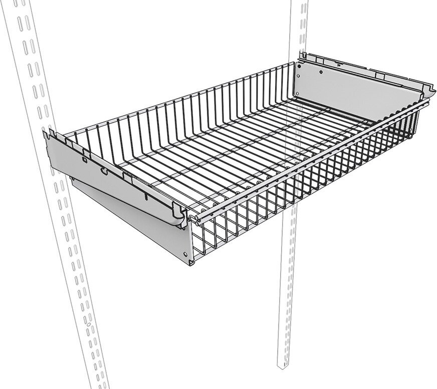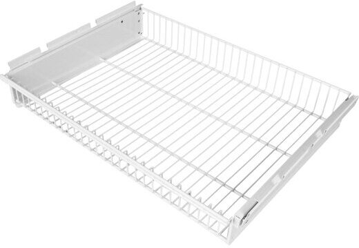 Корзина выдвижная предназначена для хранения белья и одежды в гардеробной системе. Для установки корзины используются кронштейны, закрепленные на направляющих на нужной высоте. Аксессуар позволяет организовать компактное хранение вещей, моделируя систему по своему желанию. Сетчатая конструкция обеспечивает свободную циркуляцию воздуха.