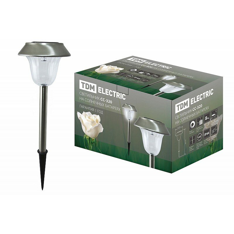 Светильник садовый СС-320 с выключателем предназначен для освещения газонов и клумб, оснащен встроенными светодиодами. Автономный, работает от солнечной батареи, время непрерывного свечения при полном заряде достигает 8 ч. Устанавливается путем погружения нижней части в грунт. Корпус размером 12,5 × 38 × 12,5 см выполнен из пластика, цвет — серый. Страна производства — Китай.