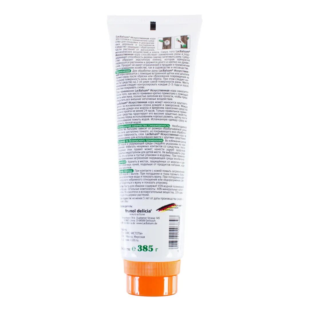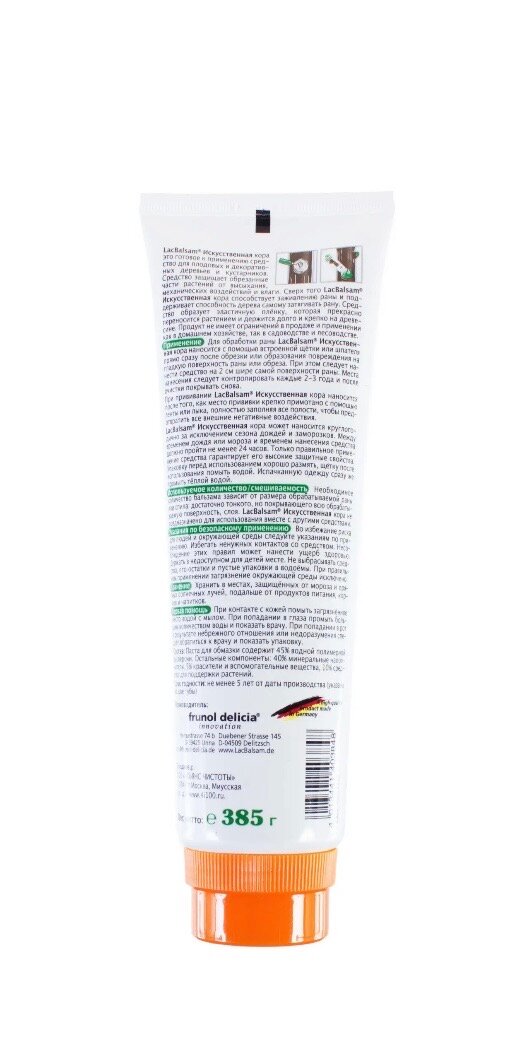 | Способ применения | Наносится с помощью встроенной щетки или шпателя прямо сразу после обрезки или образования повреждения на гладкую поверхность раны или обреза. При этом следует нанести средство на 2см шире самой поверхности раны. Места нанесения следует контролировать каждые 2-3 года и после очистки покрывать снова. При прививании Искусственная кора наносится после того, как место прививки крепко примотано с помощью ленты или лыка, полностью заполняя все полости, чтобы предотвратить все негативные воздействия |