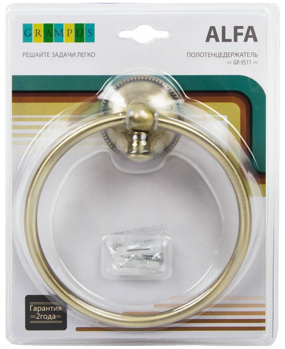 Держатель для полотенца Alfa изготовлен из металла с глянцевым покрытием цвета «античная латунь». Состоит из декоративной розетки и кольца, через которое продевается полотенце. Фиксируется к стене в ванной комнате комплектными винтами.