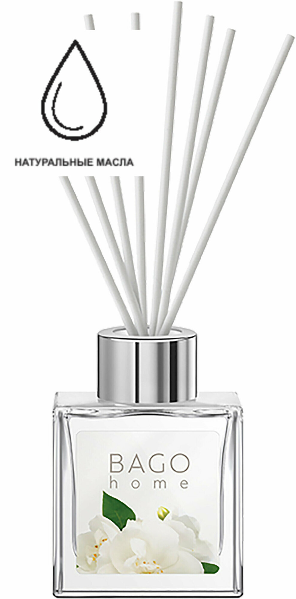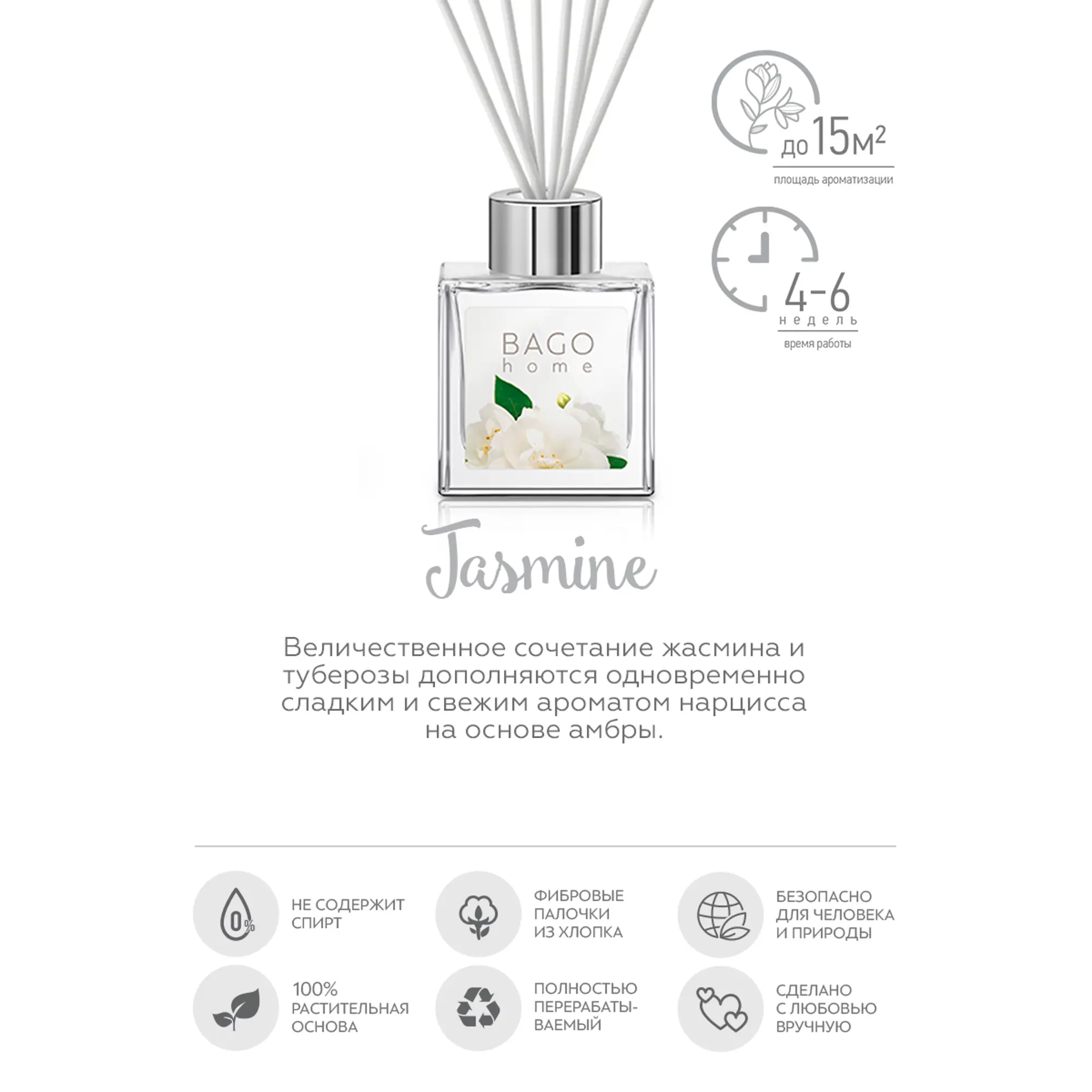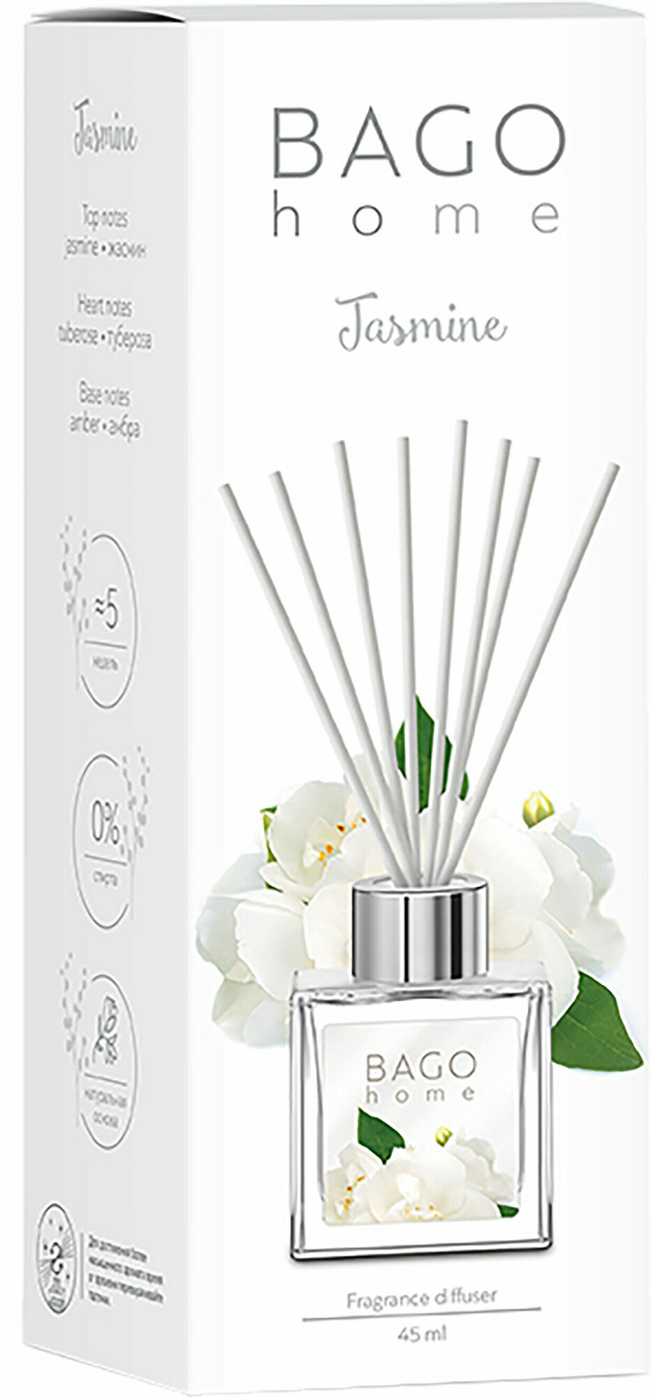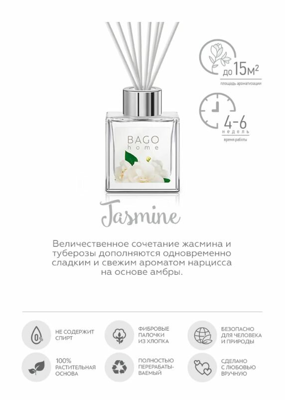 **Ароматический мини-диффузор «Жасмин»** обладает легким ненавязчивым ароматом — актуальная альтернатива освежителю воздуха. Состоит из стеклянного флакона, заполненного жидкостью, приготовленной на основе натуральных эфирных масел, и фиброволоконных палочек, которые служат распространителями аромата. Для активации диффузора нужно снять с флакона крышку, удалить пробку и разместить внутри емкости палочки.