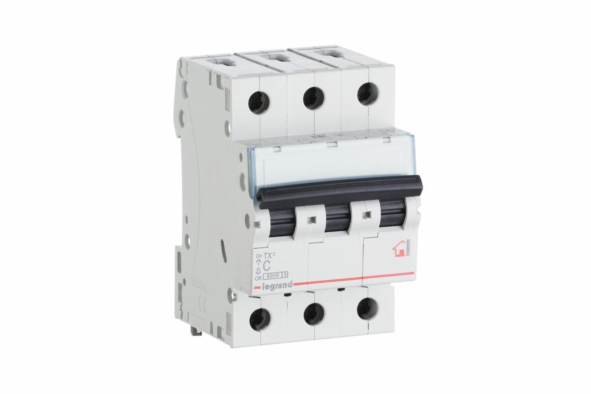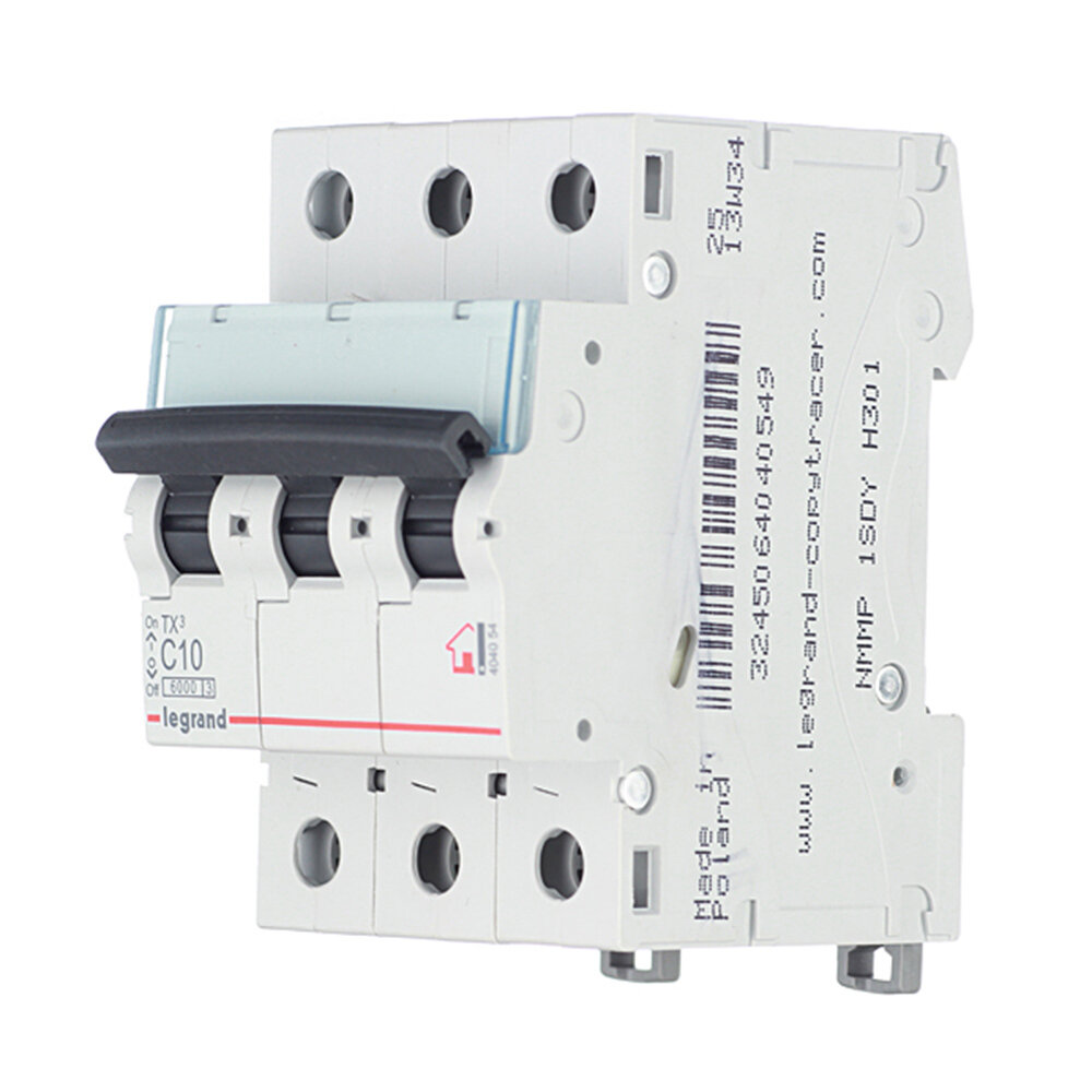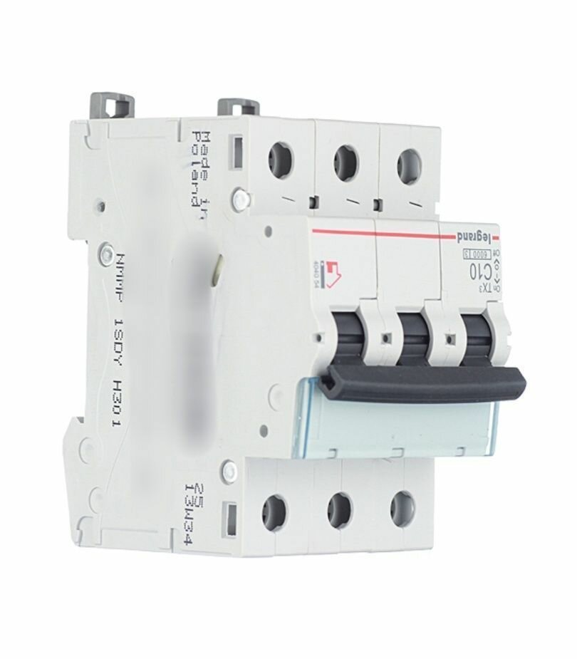 **Автоматический выключатель Legrand серии TX3**, трехполюсный, рассчитанный на ток 10А, тип С по время-токовой характеристике. Обеспечивает защиту в трехфазной сети (400 В) или линий в однофазной (230 В) от перегрузки и короткого замыкания маломощных бытовых электроприборов или групповых линий освещения подключенных кабелем малого сечения (6,6 кВт в трехфазной сети, 2,2 кВт для однофазной сети). Трехполюсные автоматические выключатели в основном применяются в трехфазной сети, но допускается их применение в однофазной сети, например если одновременно размыкать одну или две линии с нейтралью. Автоматические выключатели Legrand — это надежные устройства для защиты электроприборов и проводки от короткого замыкания и перегрузок, что снижает риски возгорания. С такими автоматическими выключателями домашняя бытовая техника и вся домашняя электросеть всегда остается под надежной защитой.