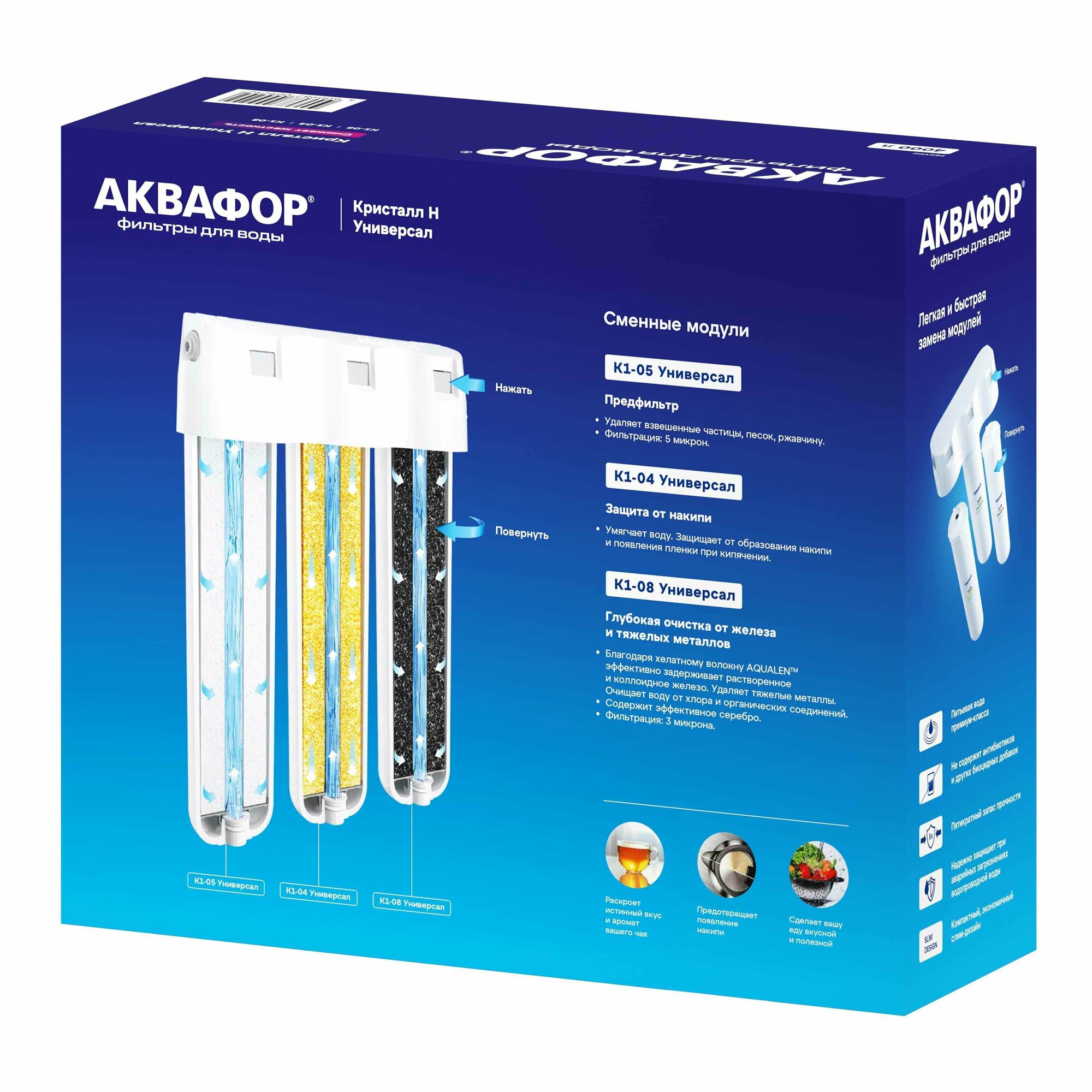 Система трехступенчатая «Аквафор Кристалл Универсал» — очистительная установка, избавляющая питьевую воду от ненужных запахов и примесей. Состоит из разных фильтрующих элементов, что означает комплексную обработку продукта. Благодаря разрушению и удалению металлических, солевых, железистых соединений вода становится безопасной и обретает мягкий вкус.