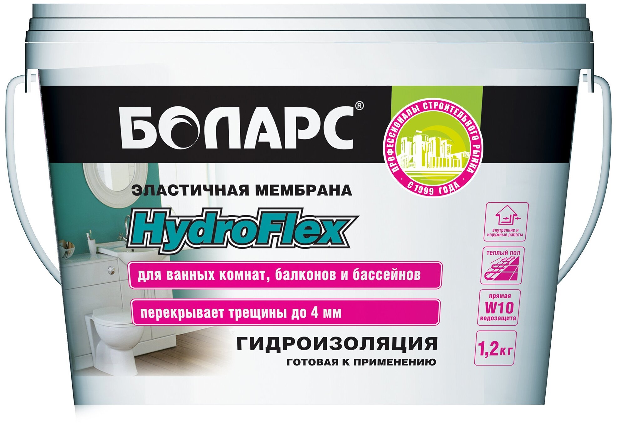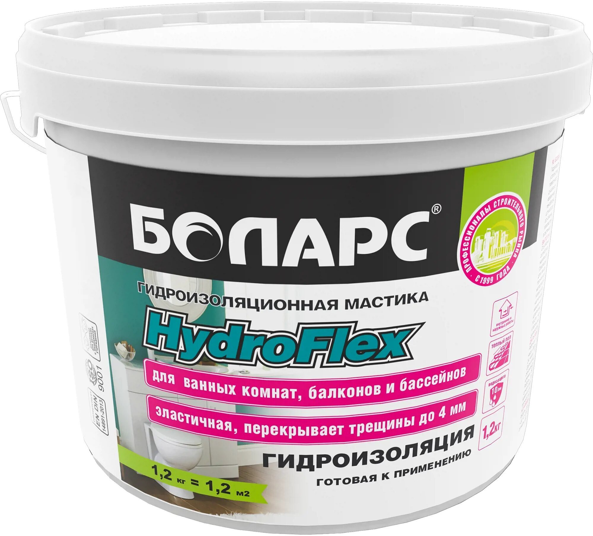 Гидроизоляционная мастика боларс «HydroFlex» предназначена для устройства бесшовной гидроизоляции стен, полов и рабочих поверхностей во влажных помещениях (кухни, ванные комнаты, душевые кабины, прачечные, балконы) перед облицовкой керамической плиткой. Для защиты оснований из бетона, кирпича, пенобетона, каменных и керамических кладок, цементно-песчаных штукатурок, в том числе для защиты чувствительных к влаге оснований: гипсовых штукатурок и полов, гипсокартонных и гипсоволокнистых листов, пазогребневых плит и блоков. Используется в системах «теплый пол». Расход материалаПри нанесении двух слоев – 1,0-1,1 кг/м2. Меры предосторожностиПри попадании раствора в глаза, промыть их большим количеством воды. Работы рекомендуется вести в резиновых перчатках. беречь от детей! Фасовка и хранениеПоставляется в пластиковых ведрах по 6 и 1,2 кг. Хранить в плотно закрытой таре при температуре воздуха от +5°С до +30°С. Не подвергать воздействию прямых солнечных лучей. Выдерживает 5 циклов замораживания/оттаивания. Гарантийный срок хранения - 24 месяца со дня изготовления.