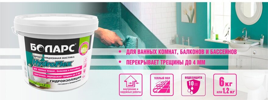Гидроизоляция БОЛАРС HydroFlex широко используется при создании водонепроницаемого слоя на полу, кухонных поверхностях, стенах, перед кладкой керамических изделий в ванной, душе или на балконе.