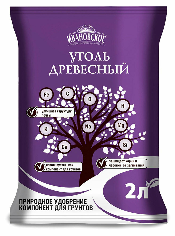 Уголь древесный служит природным удобрением и компонентом при составлении почвенных смесей. Подходит для дренирования емкостей с комнатными растениями и в чистом виде для укоренения черенков. Содержит большой набор полезных для растений микро- и макроэлементов.