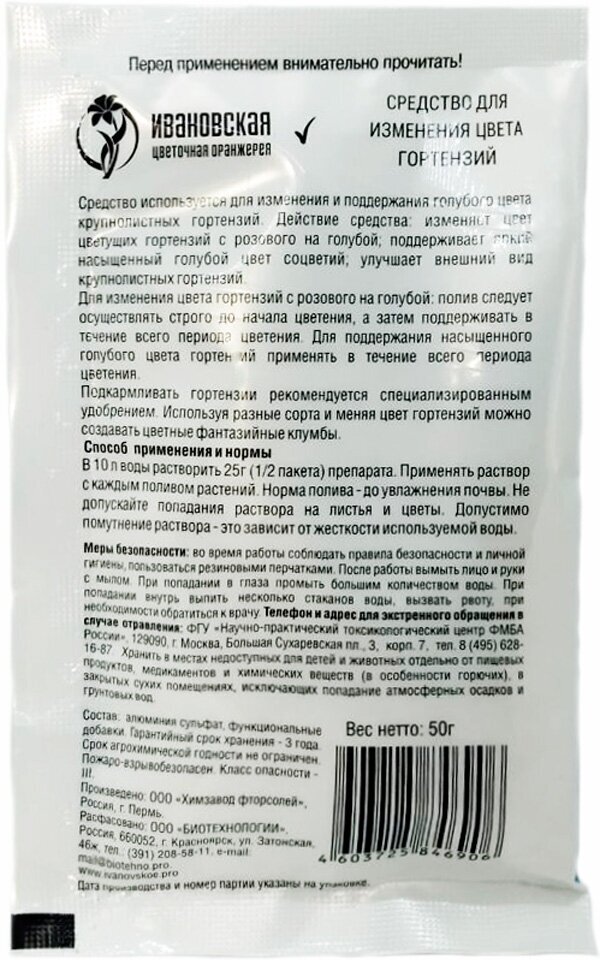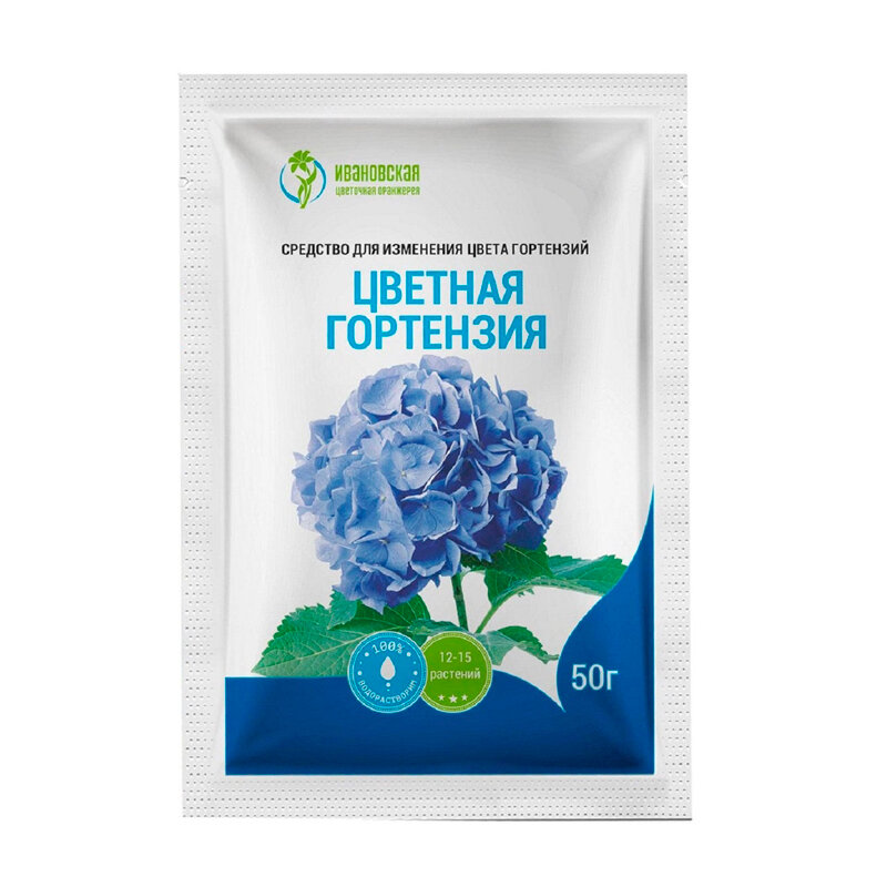 «Цветная гортензия» — концентрированное средство с сульфатом алюминия для изменения оттенка лепестков. Способствует выработке пигмента, который изменяет розовый цвет гортензий на голубой. При регулярном применении улучшается внешний вид растений (соцветия становятся крупнее и пышнее), сохраняется сочный яркий оттенок.