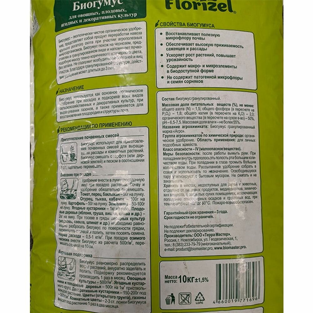 Удобрение Florizel «Биогумус» создано на основе навоза крупного рогатого скота. Предназначено для выращивания декоративных и сельскохозяйственных растений, газонов. Используется при посадке растений, в качестве прикорневой подкормки и для восстановления плодородной структуры почвы. Выпускается в виде гранул, напоминающих грунтовую смесь без запаха.