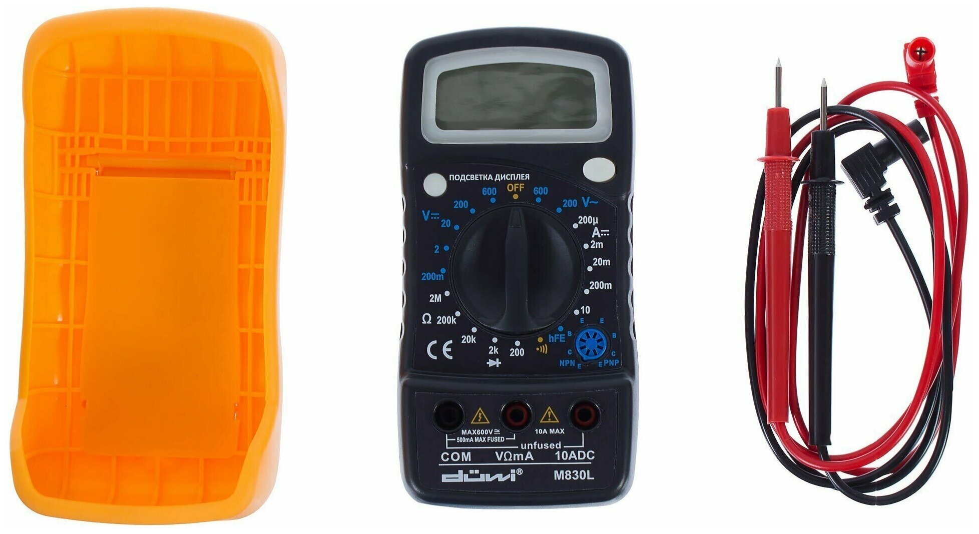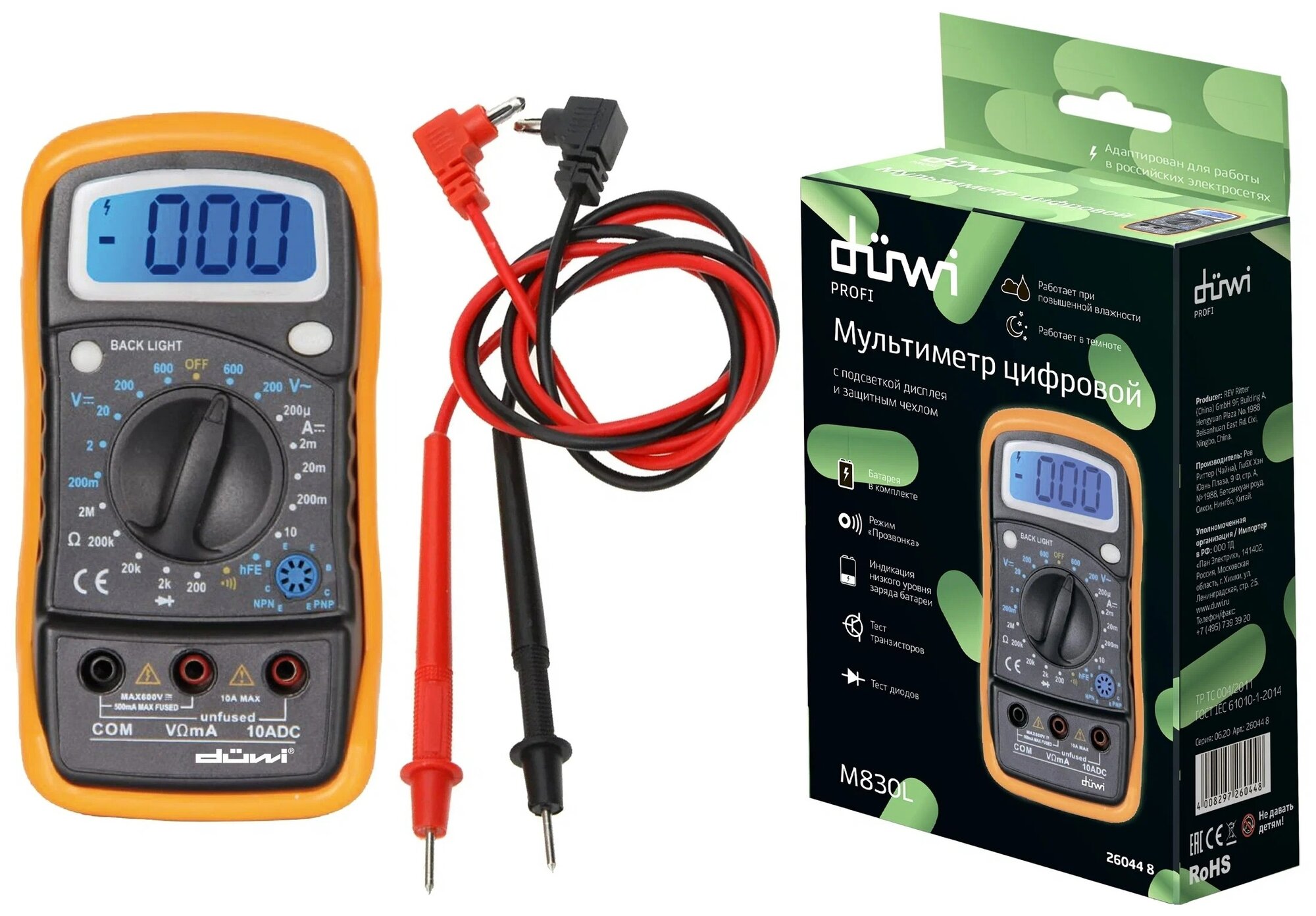 Цифровой мультиметр c противоударным изолирующим чехлом и подсветкой M830L — Цифровой мультиметр используется для измерения постоянного и переменного напряжения, постоянного и переменного тока, сопротивления, проверки диодов и «прозвонки» цепи.