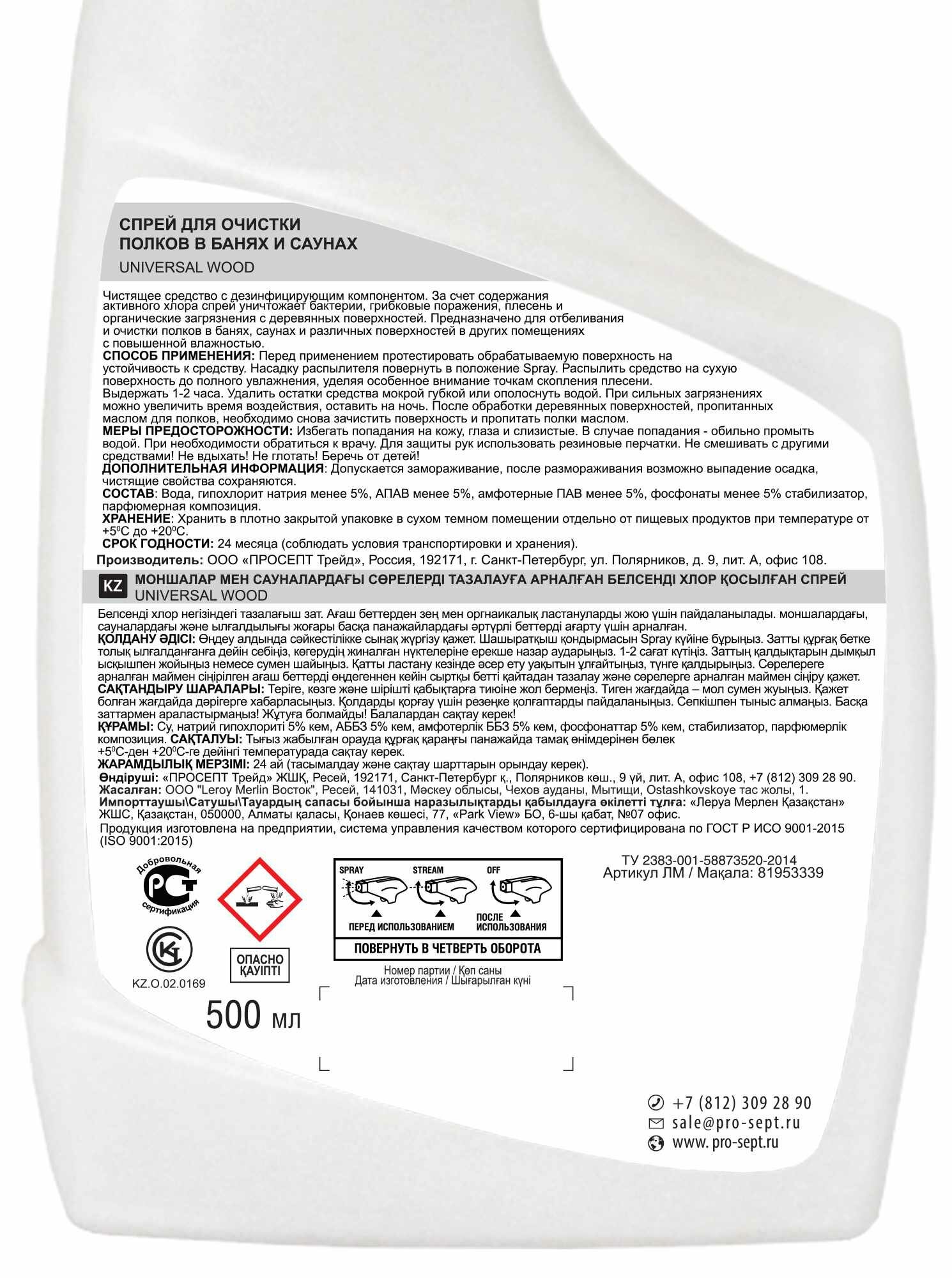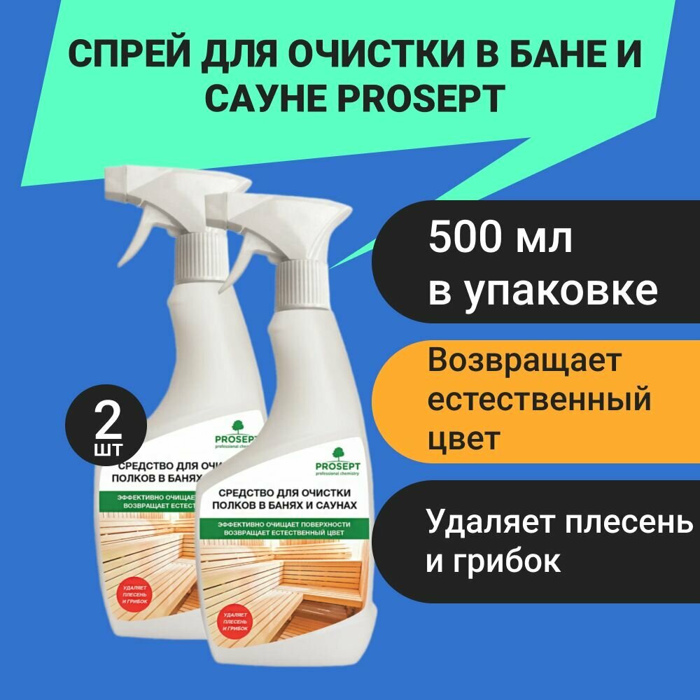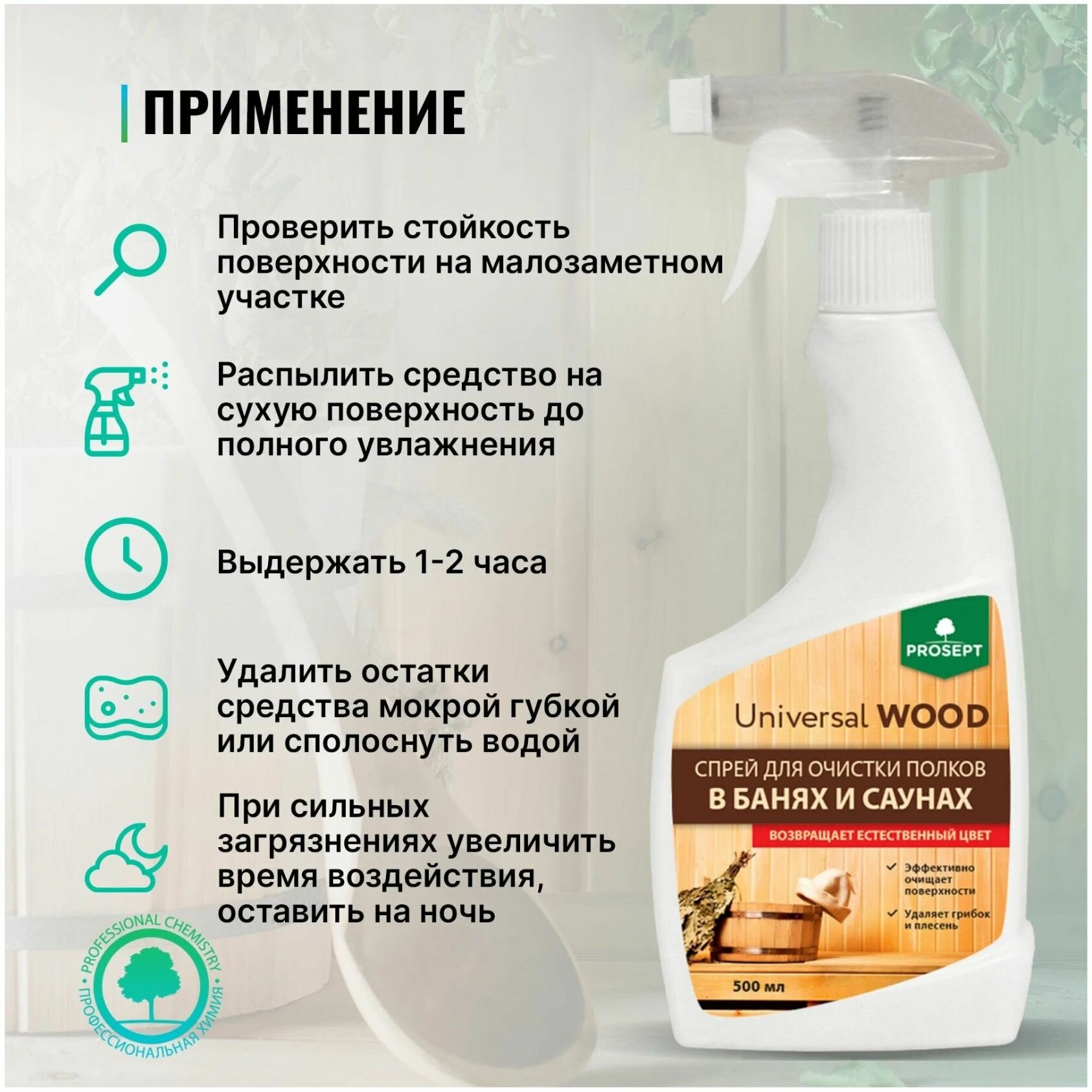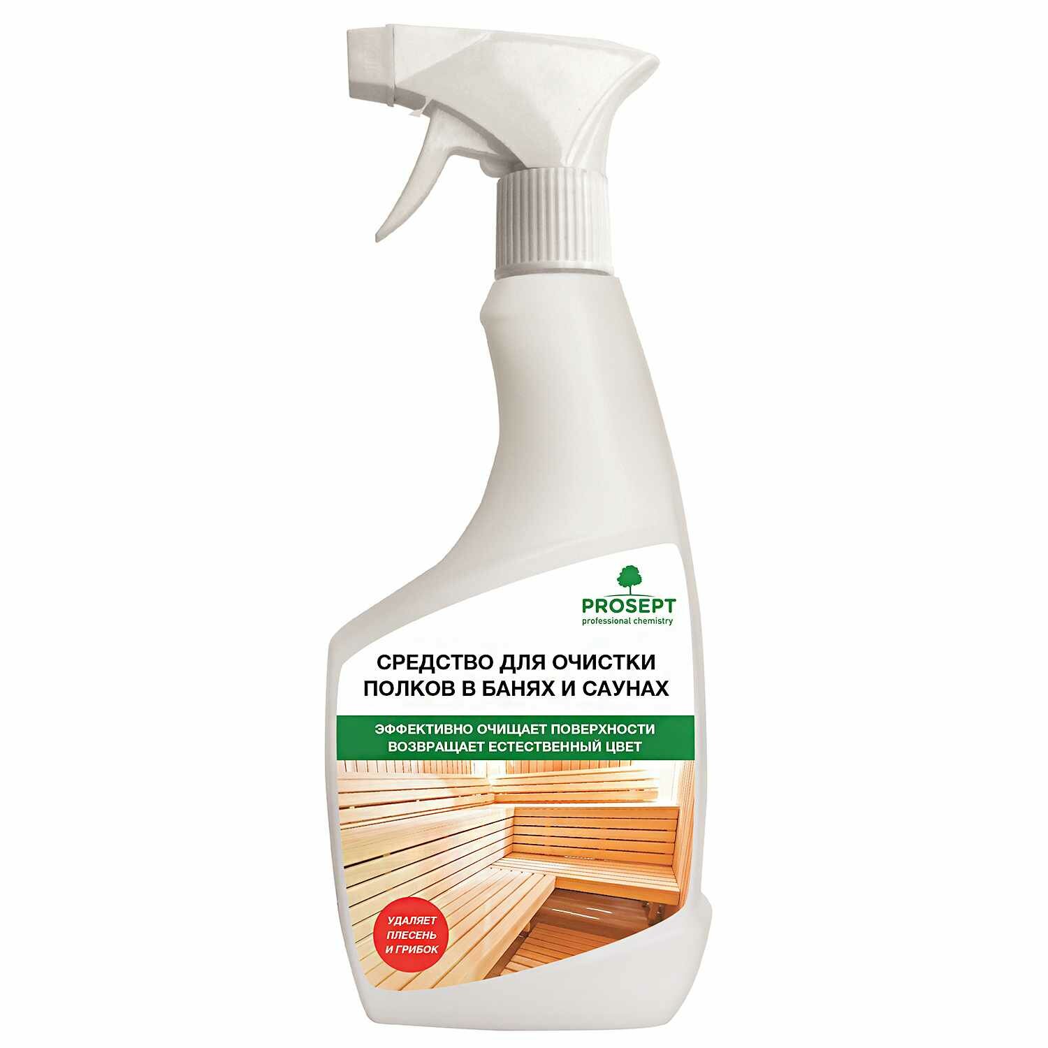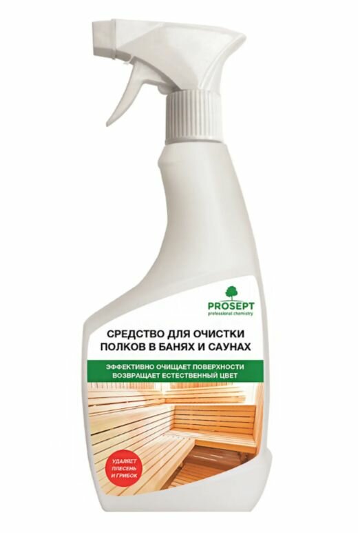 Спрей для очистки полков в бане и сауне Prosept — готовый состав для очистки поверхностей из древесины. Средство уничтожает плесень, бактерии, грибок, органические загрязнения и предназначен для работы с объектами, расположенными в помещениях с высокой влажностью.