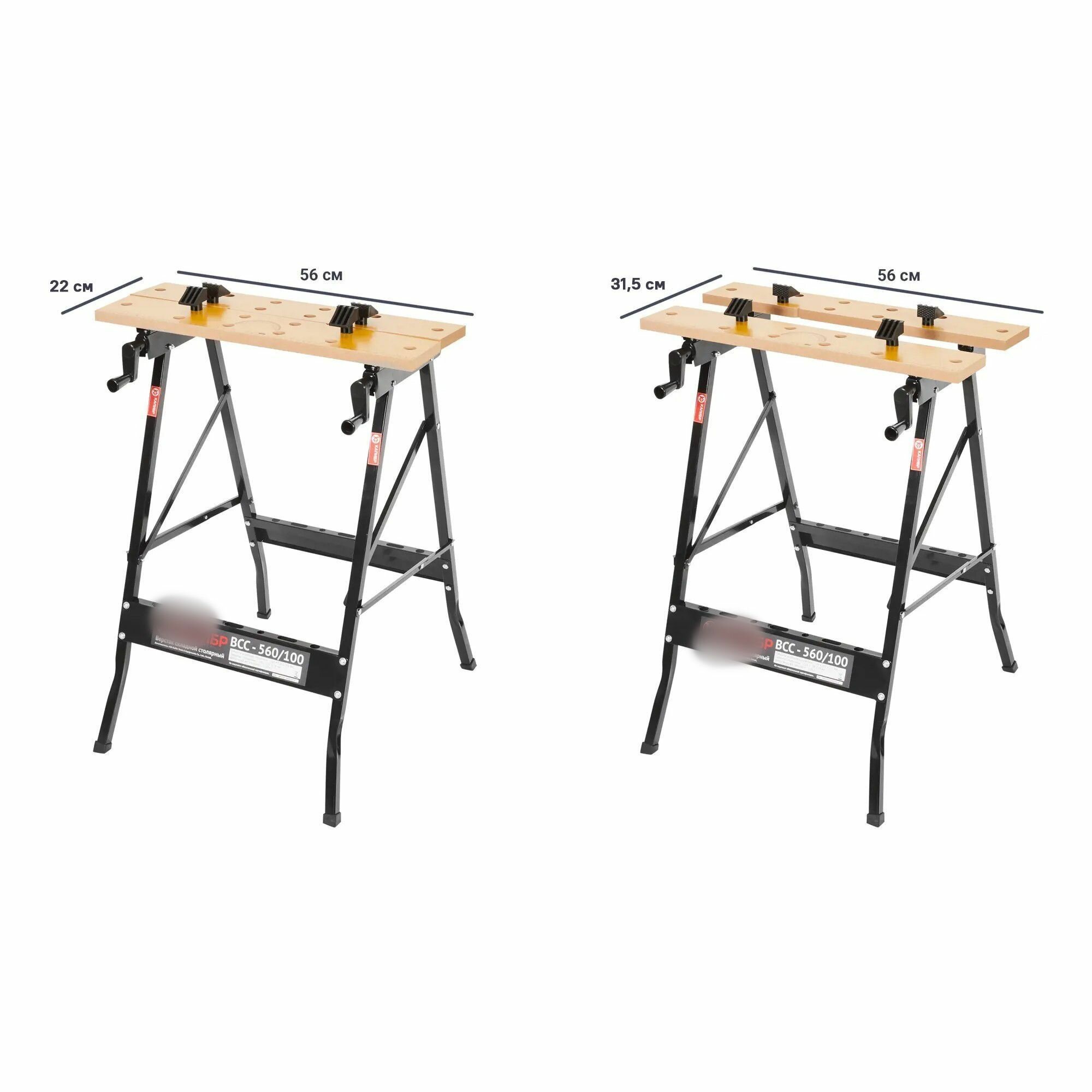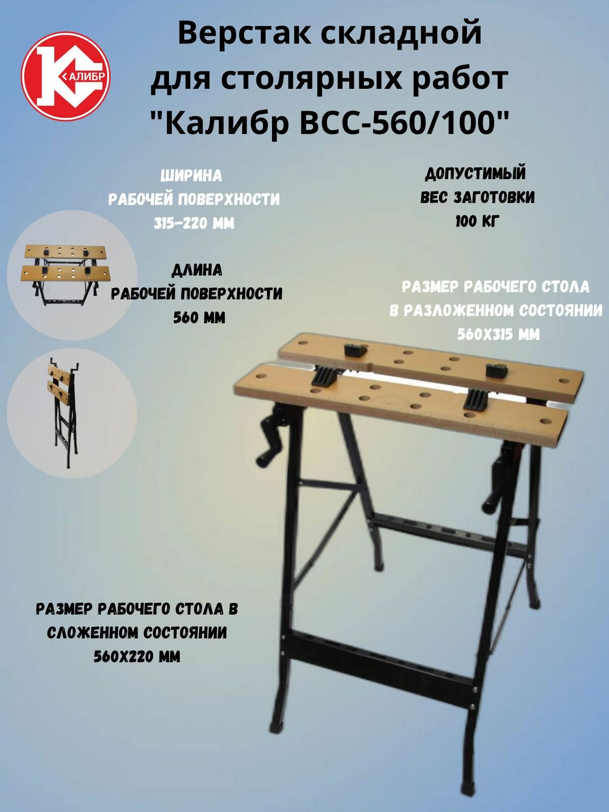 Верстак «Калибр» ВСС-560/100 используется при ведении столярных работ. Отличительные особенности — компактные габариты и складывающаяся конструкция. Это позволяет обходиться без регулярной сборки-разборки оборудования.