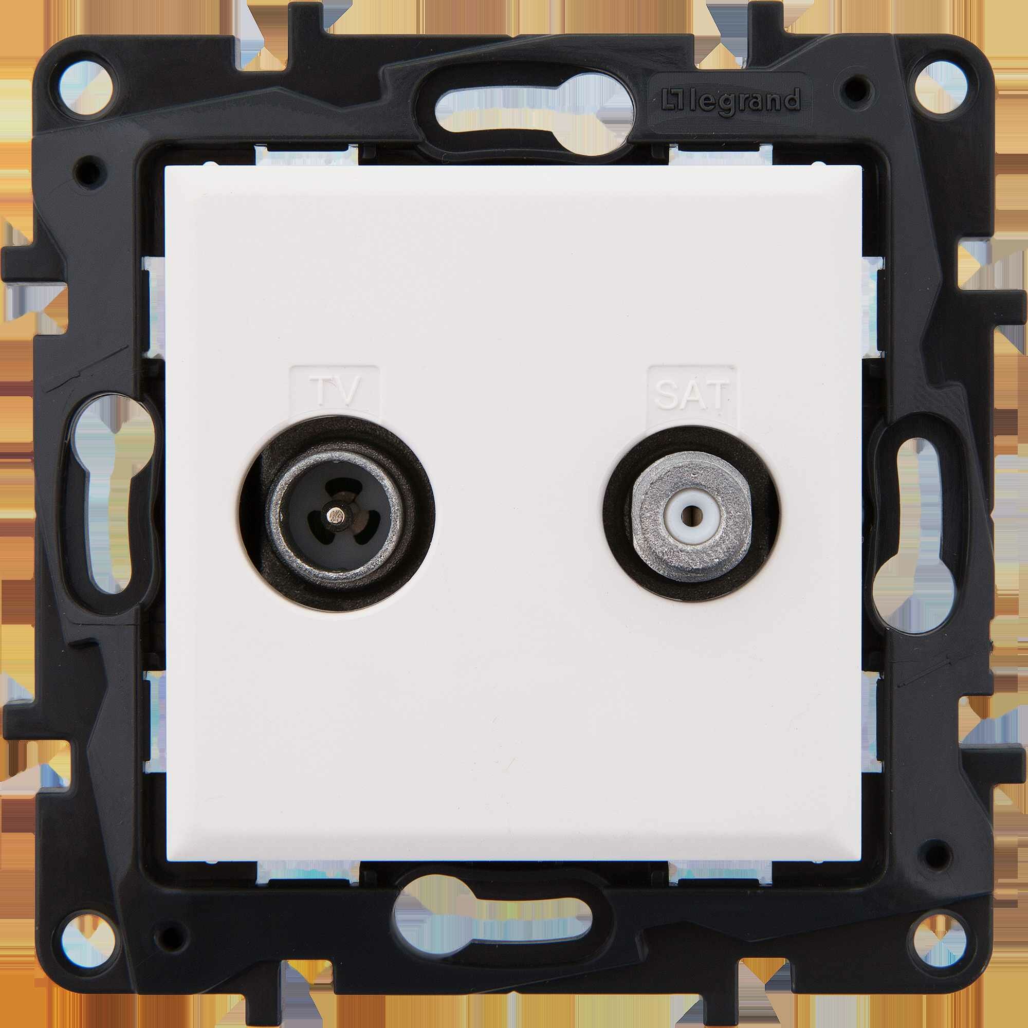 ТВ-Спутниковая розетка двухкабельная тип "звезда" Legrand Structura, цвет белый,скрытого монтажа, имеет два независимых входа и выхода для подключения эфирного и спутникового телевидения. Позволяет добавить подключение спутникового ТВ без изменения существующей структуры эфирного ТВ, простой заменой розетки