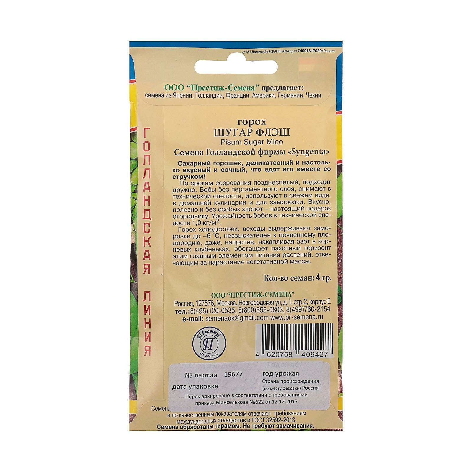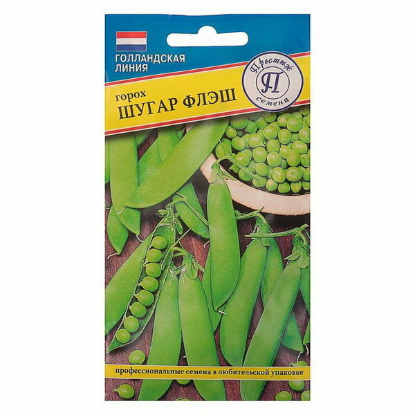 Горох «Шугар флэш» — деликатесный сорт голландской селекции с очень вкусными, сладкими плодами без грубой пергаментной пленки, благодаря чему их употребляют цельными. Горошины замораживают, можно подвергать другим видам обработки. Сорт холодостойкий, выдерживает заморозки до -6 °С, позднеспелый. Улучшает состав почвы. Урожай созревает дружно.