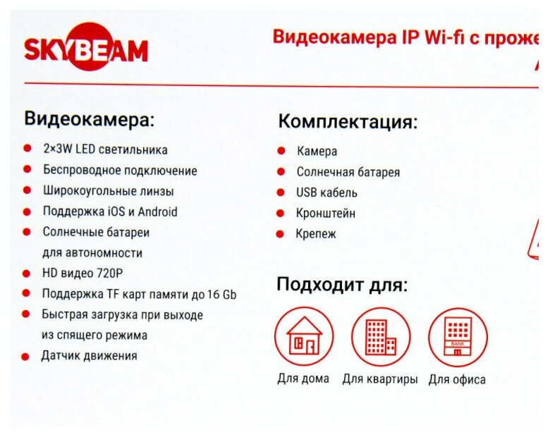 | Применение продукта | Камера видеонаблюдения с питанием от встроенного аккумулятора и солнечной панели, прожекторами подсветки, датчиком движения, подключение через интернет по сети WiFI позволяет осуществлять видеонаблюдение с мобильных устройств подключенных к сети интернет |