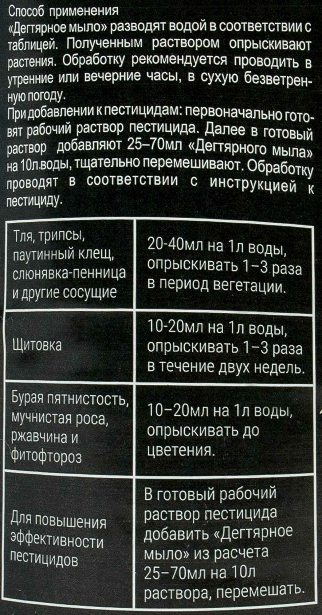 Средство от вредителей садовых растений «Дегтярное мыло» предназначено для защиты комнатных и садово-огородных растений. Изготовлено с использованием березового дегтя. Используется как самостоятельный препарат и для усиления эффективности пестицидов.
