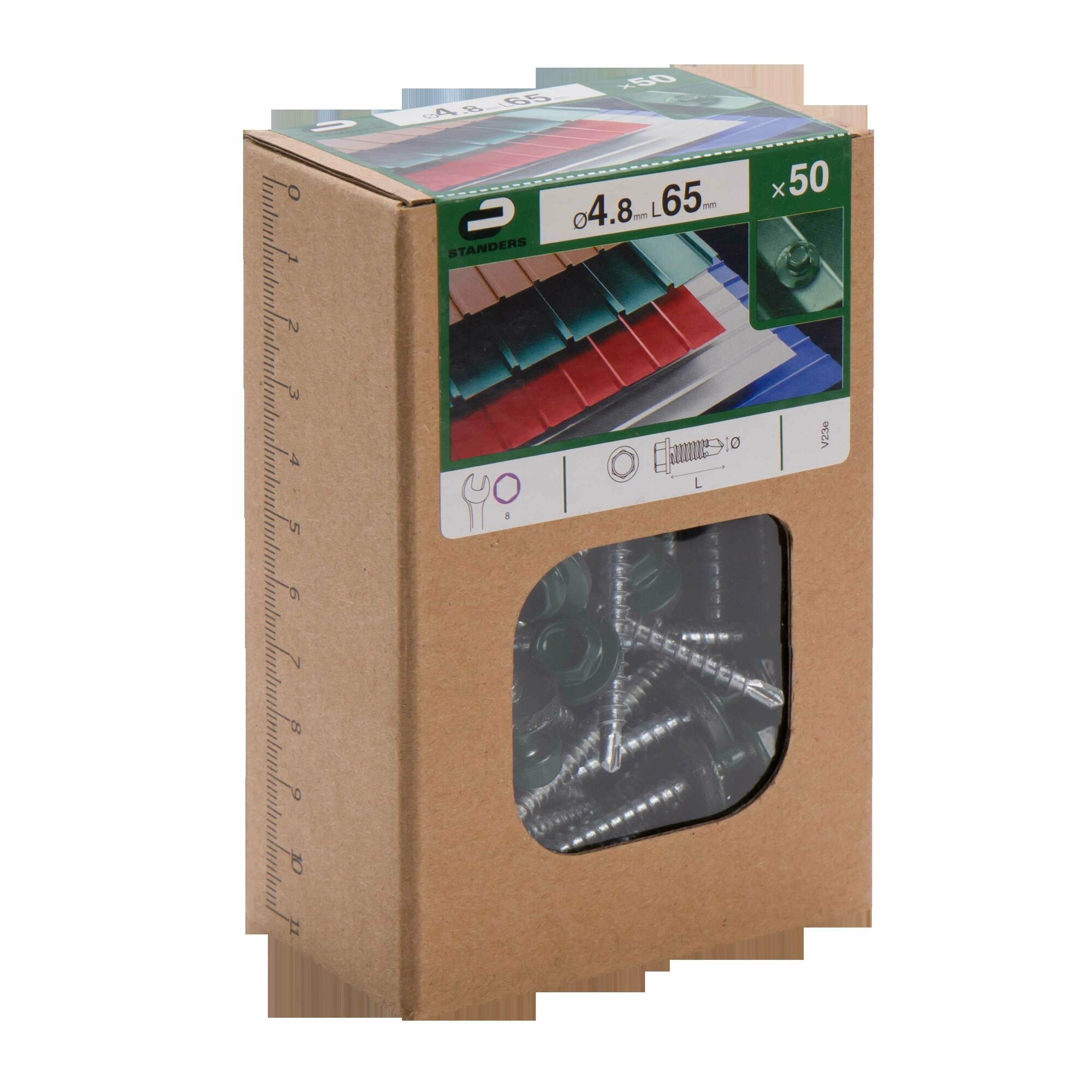 Саморез кровельный Standers предназначен для монтажа листов из тонкого металла — кровельного железа, металлочерепицы, профилированных щитов. Метиз диаметром 4,8 мм и длиной 65 мм изготовлен из оцинкованной стали. Шестигранная головка зелёного цвета (под цвет закрепляемого материала) дополнена шайбой с герметизирующей прокладкой. Для монтажа используется специальная бита и гаечный ключ 8 мм.