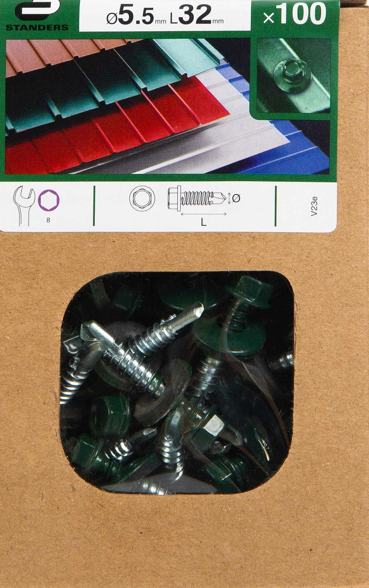 Саморез кровельный Standers диаметром 5,5 мм и длиной 32 мм используется для крепления листовых материалов, металлочерепицы, профнастила к горизонтальным, наклонным или вертикальным поверхностям. Применяется при кровельных и отделочных работах, строительстве заборов и ограждений. Саморезы хорошо фиксируют листы с плоской или фигурной поверхностью на основаниях из металла. В наборе 100 шт.
